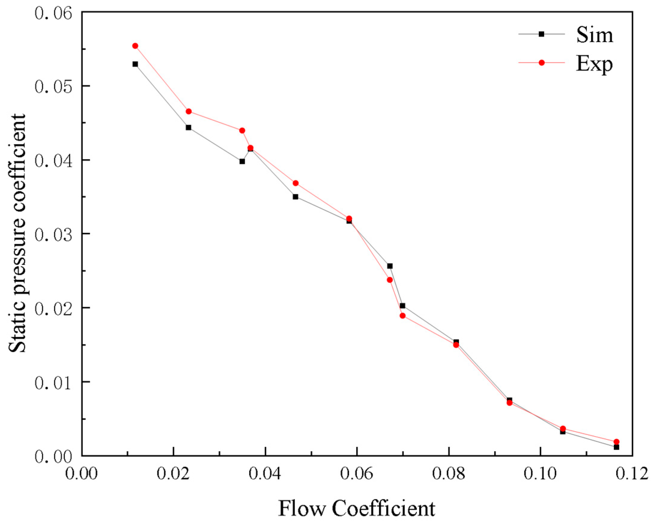Figure 6. Comparison of test and simulation results for the flow and pressure coefficients.