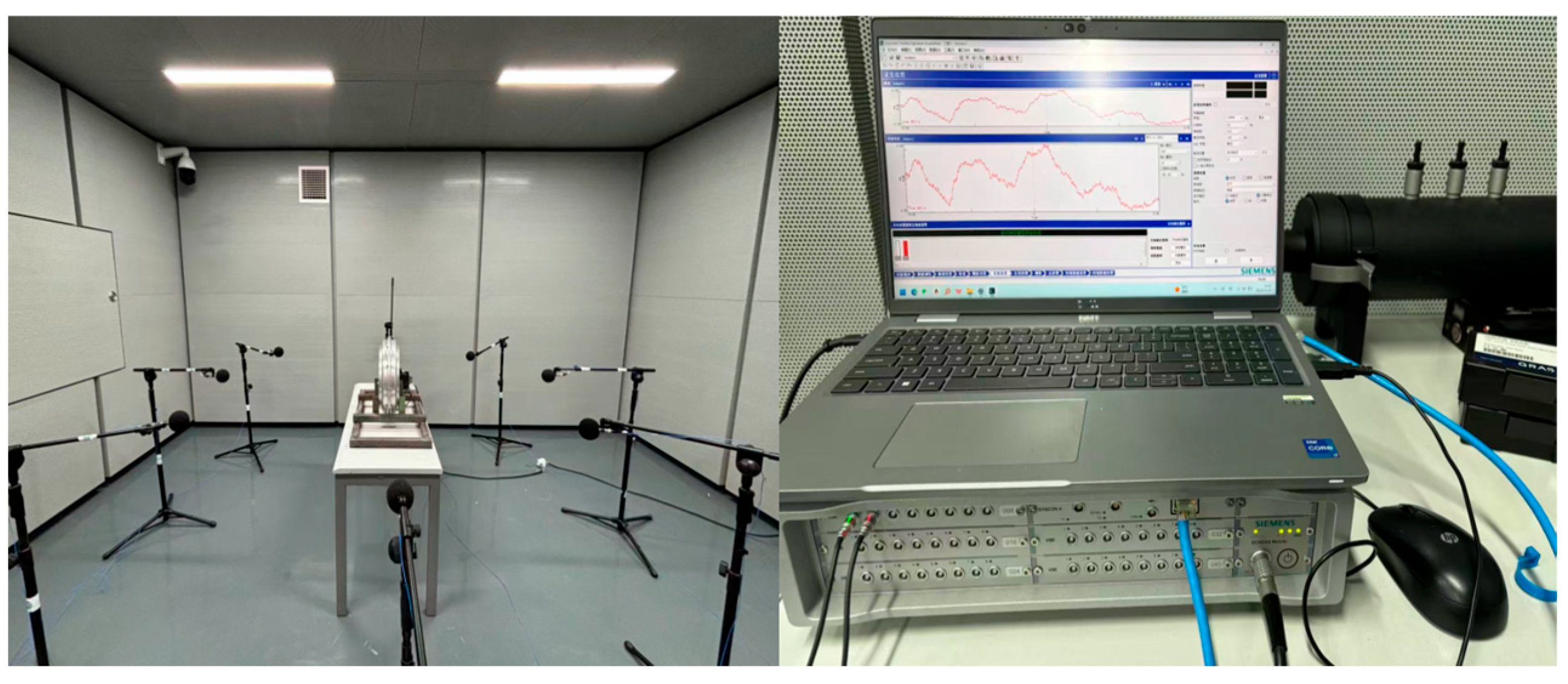 In Figure 7, to measure the noise of the optimized fan in an acoustically treated test room, the chamber has dimensions of 3650 mm in length, 3000 mm in width, and 3200 mm in height, with a cut-off frequency of 200 Hz and a background noise level of 12.86 dB (A). As illustrated in the figure, the semi-anechoic chamber experiment was established in accordance with GB/T 2888-2008 [33] Measurement Methods for Noise of Fans and Roots Blowers. A GRAS 46AE microphone (GRAS Sound & Vibration, Holte, Denmark), Simcenter SCADAS SCM2E05 (Siemens Digital Industries Software, Plano, TX, USA) data acquisition chassis, and Simcenter Testlab data analysis software (2306) were employed. Microphones were positioned 1 m away from the fan inlet, aligned with the fan shaft, and arranged at 45° intervals around the shaft. Synchronous monitoring was performed to record the sound pressure in real time.
