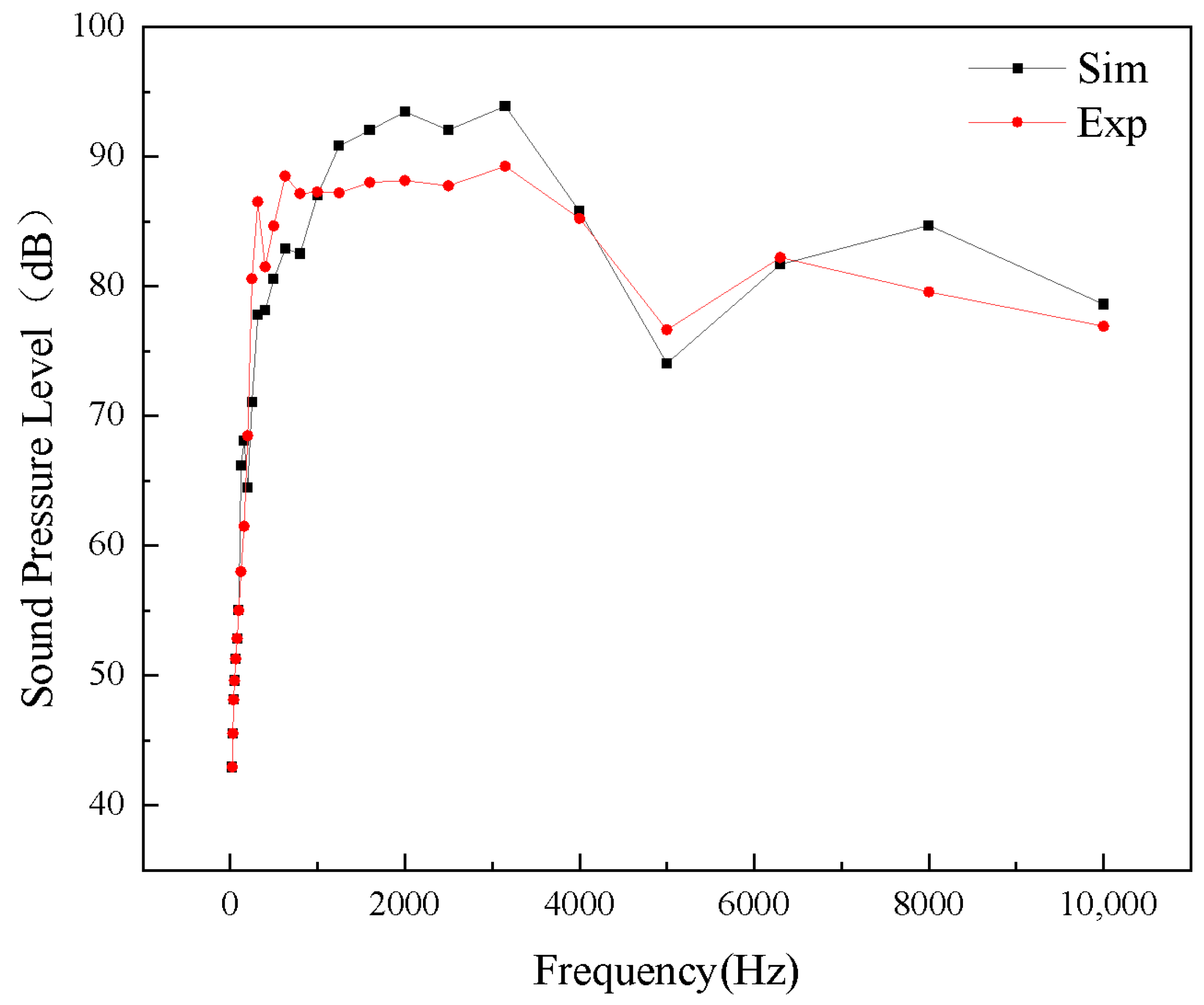 In addition to structural vibration, several other factors may contribute to the discrepancy between the numerical and experimental SPL results. First, unavoidable uncertainties in the acoustic experiment, including microphone positioning, background reflections, and installation-induced disturbances, may affect the measured sound pressure levels. Second, the FW-H acoustic analogy, although effective for comparative far-field prediction, cannot fully capture structure-borne noise and certain installation effects present in the experiment. Third, geometric simplifications introduced in the numerical model, such as the omission of minor structural details, may also slightly alter the local flow field and acoustic response. Therefore, the observed 4.38% error is considered acceptable for the present aeroacoustic analysis, while the remaining difference can be reasonably attributed to the combined influence of structural, experimental, and modeling factors.