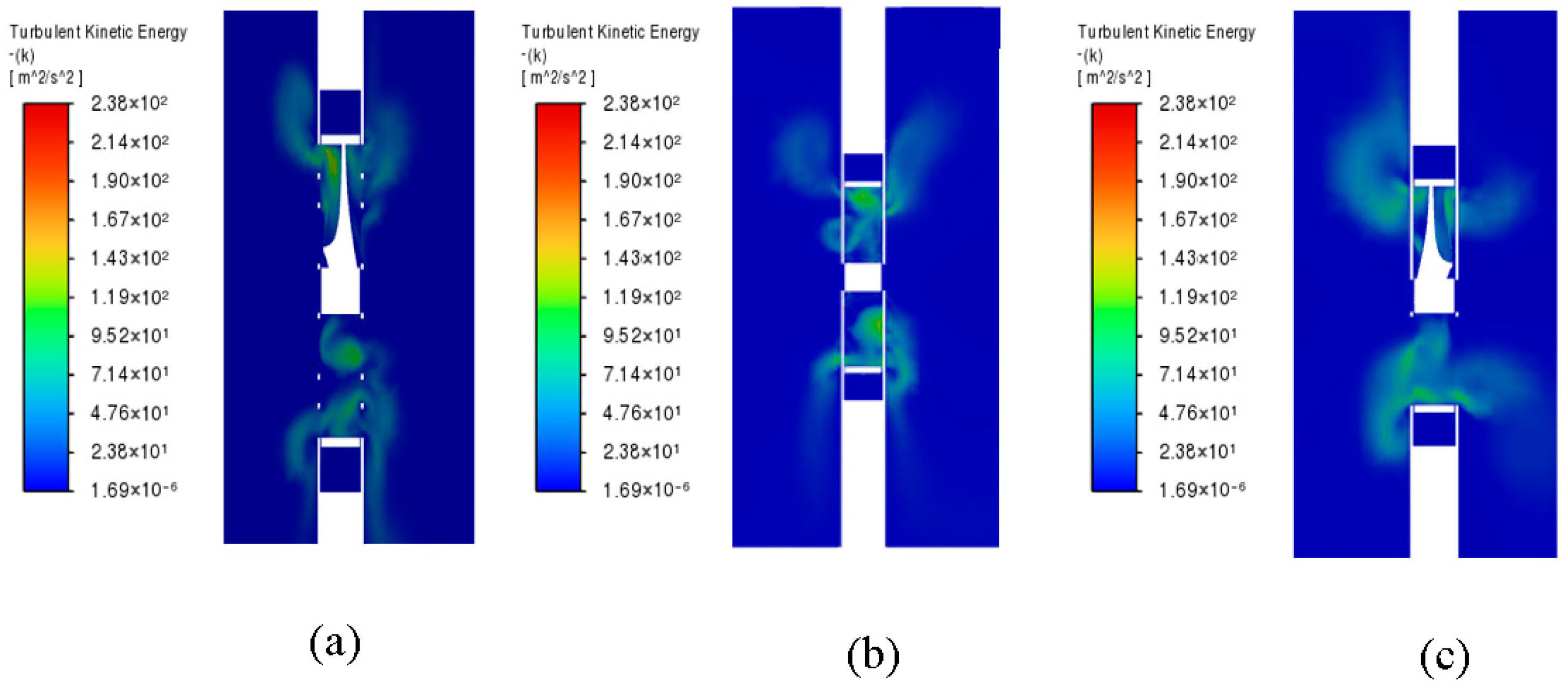 At a blade rotational speed of 4000 rpm, the flow coefficients of Models a, b, and c are 0.1138, 0.1124, and 0.1128, respectively, indicating that the three strut configurations have only a limited influence on the overall flow capacity. However, despite these similar global aerodynamic performances, the internal flow organizations differ markedly. This suggests that the strut geometry mainly affects flow stability and unsteady structure evolution rather than the bulk flow rate. Therefore, the following analysis focuses on turbulent kinetic energy distribution, vortex evolution, and pressure-related unsteady characteristics.