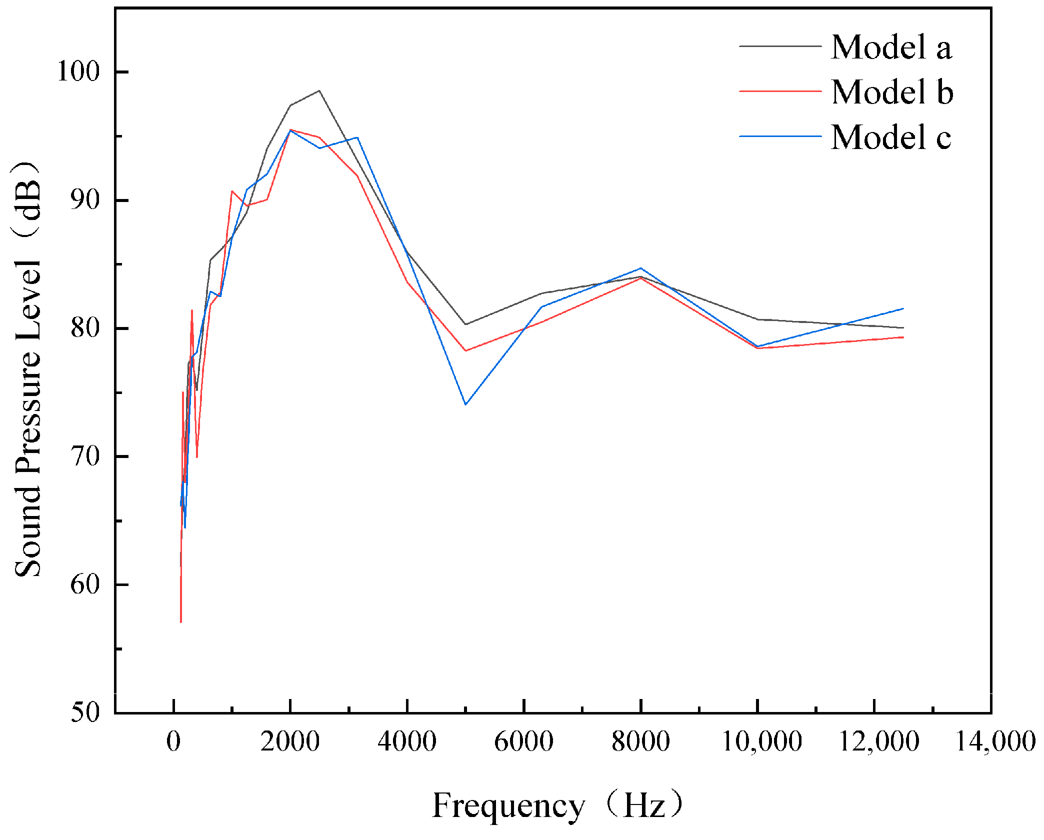 The fan features five blades rotating at 4000 rpm, resulting in a blade passing frequency (BPF) of 333.33 Hz, as shown in Figure 12. The control strategy implemented in this study effectively mitigates noise levels at the BPF and, notably, in the vicinity of its first harmonic. This harmonic region, characterized by a narrowband hump-shaped noise profile, exhibits significant attenuation. In particular, Model c realizes a 6.7 dB reduction in comparison with Model a.