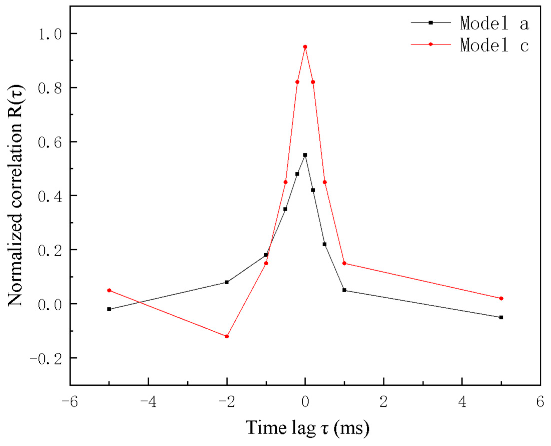 Figure 14. Normalized spanwise cross-correlation R (τ) for Model a and Model c.