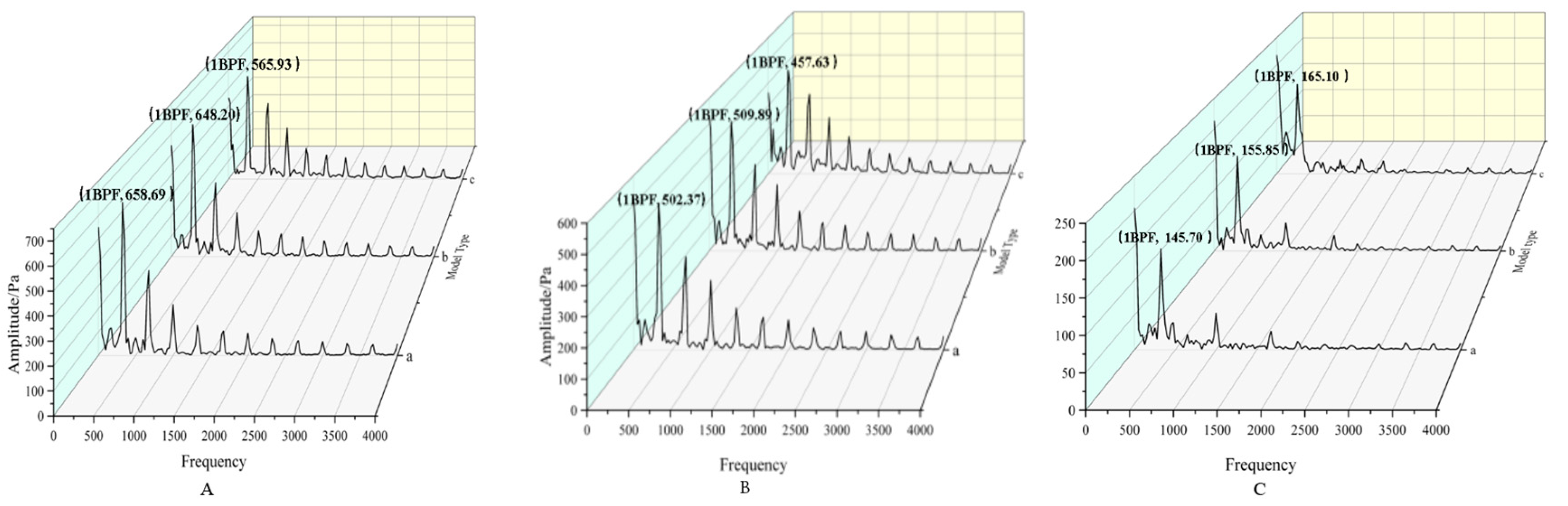 Pressure fluctuation characteristics exhibited distinct frequency and spatial differences among the three configurations. Compared with Model a, Model c showed a clear reduction in pressure pulsation amplitude, especially near the blade tip, indicating weaker unsteady aerodynamic loading in the main flow region. This trend is consistent with the observed reduction in wake coherence and trailing-edge vortex intensity. The gradual reduction in pressure amplitude demonstrated that structural improvements suppressed unsteady tip flow, enhanced the stability of the internal flow field, and reduced the potential for vibration and noise radiation induced by pressure pulsations. These results indicate that the reduction in unsteady pressure loading, especially near the blade tip, is directly associated with the attenuation of tonal noise emission in the BPF and harmonic bands