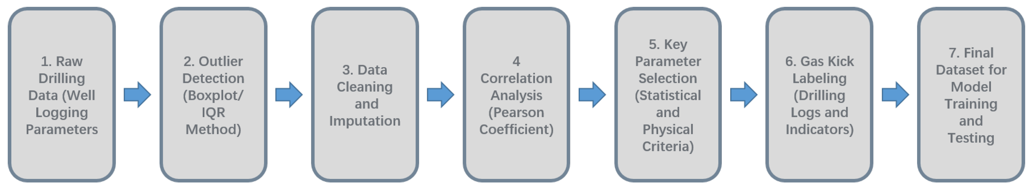 To ensure data reliability and modeling robustness, a systematic data preprocessing pipeline was established, including outlier detection, data cleaning and imputation, feature correlation analysis, and gas kick labeling. Specifically, abnormal values were first identified and removed using statistical criteria, followed by feature-level preprocessing to mitigate noise and missing information. Subsequently, correlation-based analysis combined with drilling engineering knowledge was employed to select key monitoring parameters.