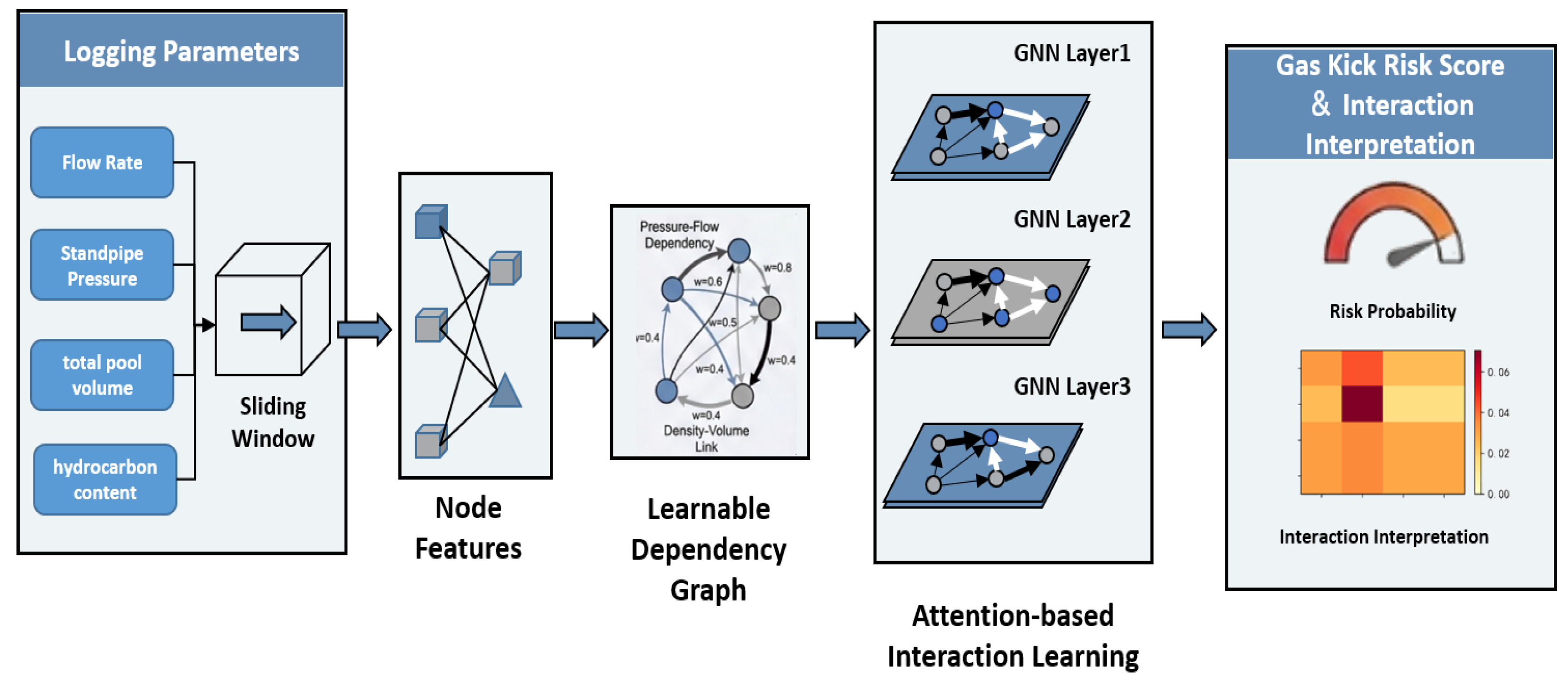 Drilling time-series measurements are encoded as node features through sliding-window processing and mapped into a learnable dependency graph where parameters are treated as interconnected nodes. Attention-driven graph propagation captures heterogeneous interactions and deviation patterns among parameters, enabling robust representation learning under varying operational conditions. The resulting embeddings are processed by fully connected layers to produce risk predictions, while the attention weights offer insights into influential parameter interactions, supporting interpretability analysis.