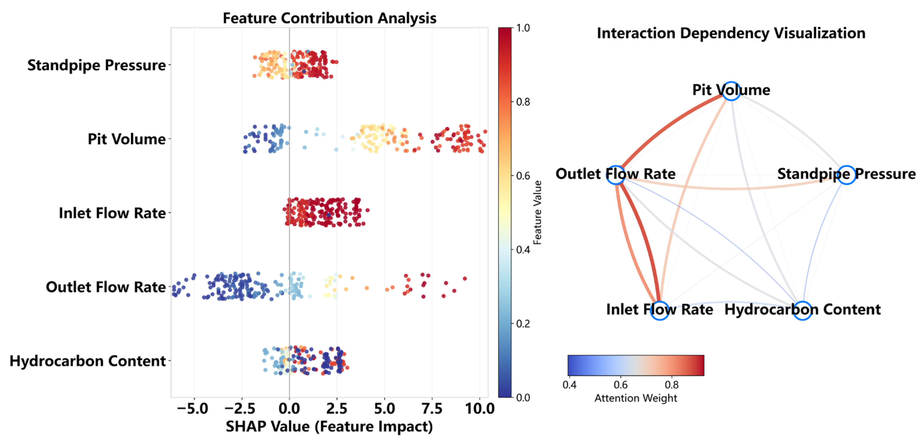 The left panel presents SHAP-based feature attribution, illustrating the global contribution distribution of drilling parameters influencing gas kick prediction. The right panel visualizes attention-derived interaction dependencies learned by the graph neural model, highlighting dominant parameter coupling pathways during anomaly characterization. Together, these perspectives provide complementary transparency at both feature and structural levels, supporting engineering validation and trustworthy deployment.