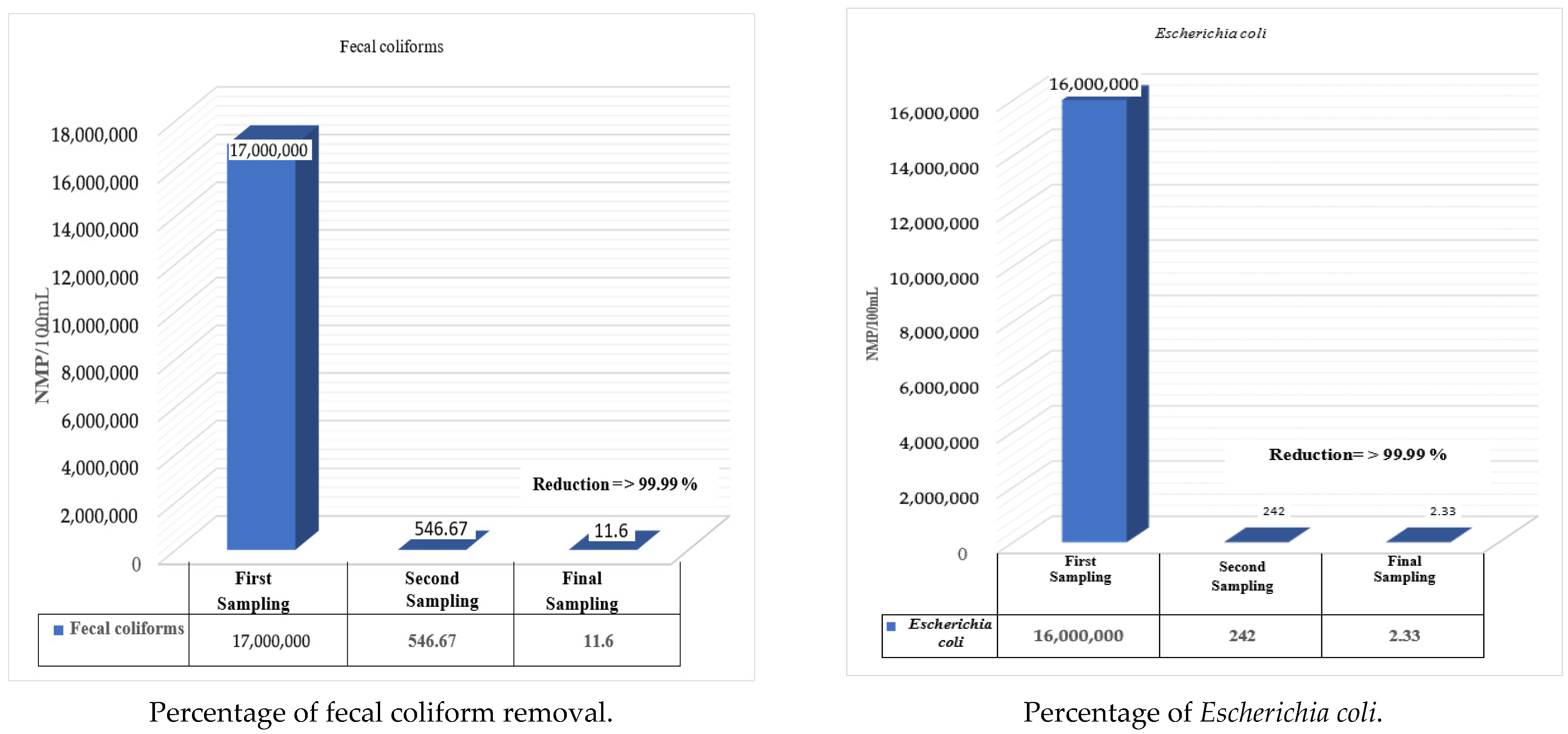 | Fecal coliforms | 17,000,000 | 546.67 | 99 | 11.60 | 99.99 |