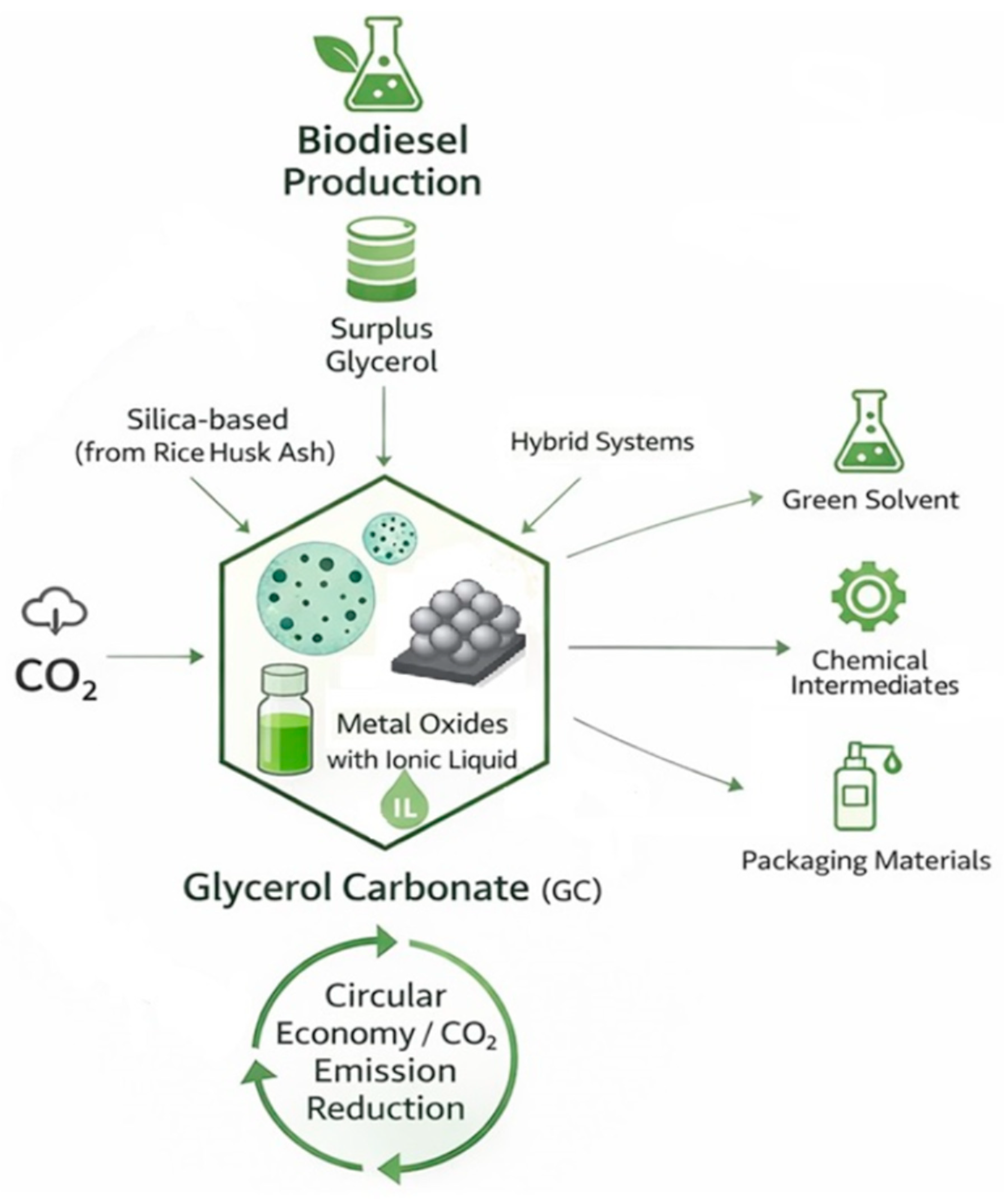 Chicago/Turabian StyleTodero, Adriele Sabrina, Paloma Truccolo Reato, Fabiana de Oliveira Pereira, Rogélly Baldin, Alexander Junges, Rogério Marcos Dallago, and Marcelo Luis Mignoni. 2026. "Catalytic CO2 Fixation via Glycerol Carbonate Synthesis: Review of Silica Hybrids and Ionic Liquid Advancements" Processes 14, no. 7: 1151. https://doi.org/10.3390/pr14071151