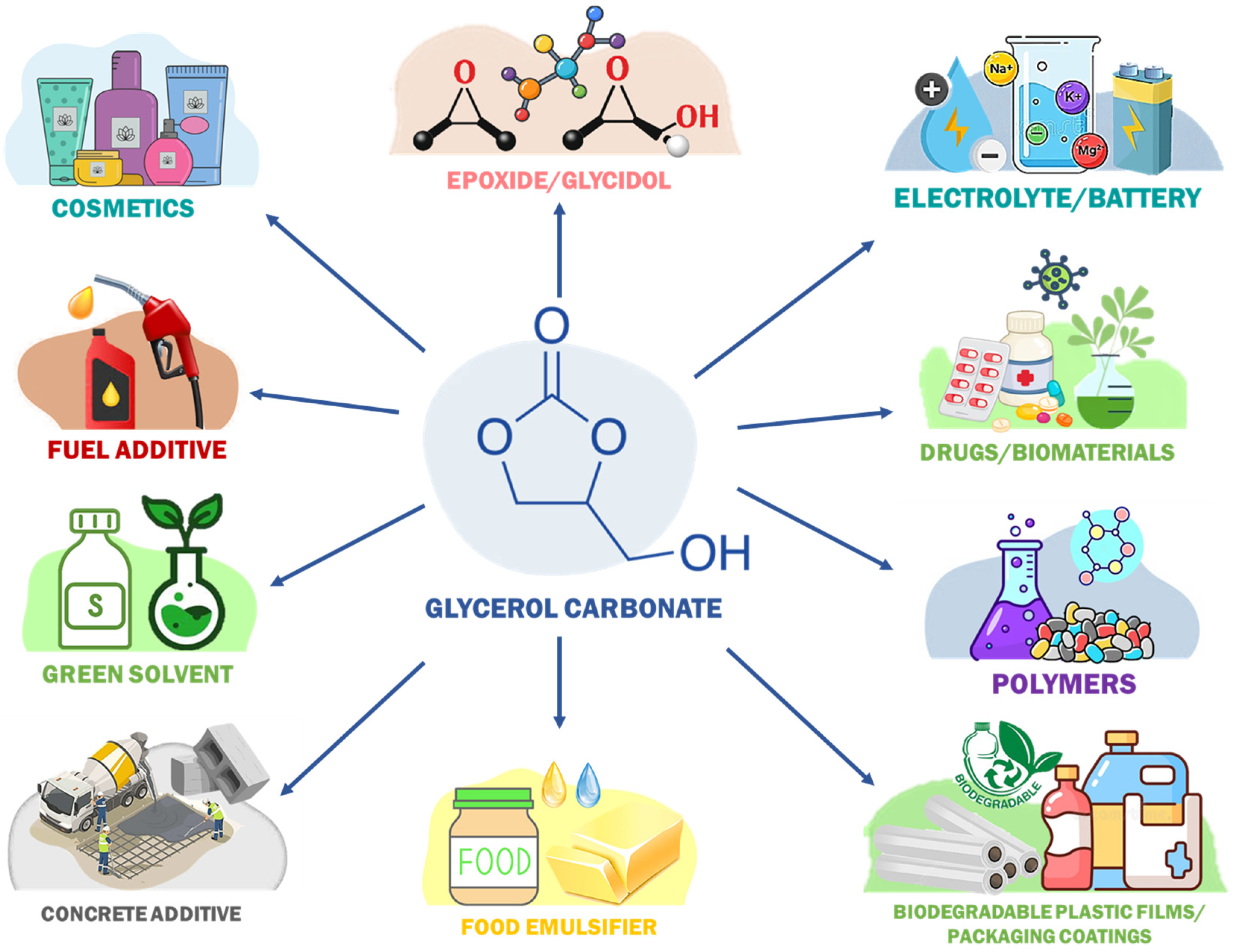 - Karmee, S.K. A Review on Preparation and Applications of Glycerol Carbonate: Focus Biocatalysis. Biocatal. Biotransform. 2024, 42, 286–307. [Google Scholar] [CrossRef]