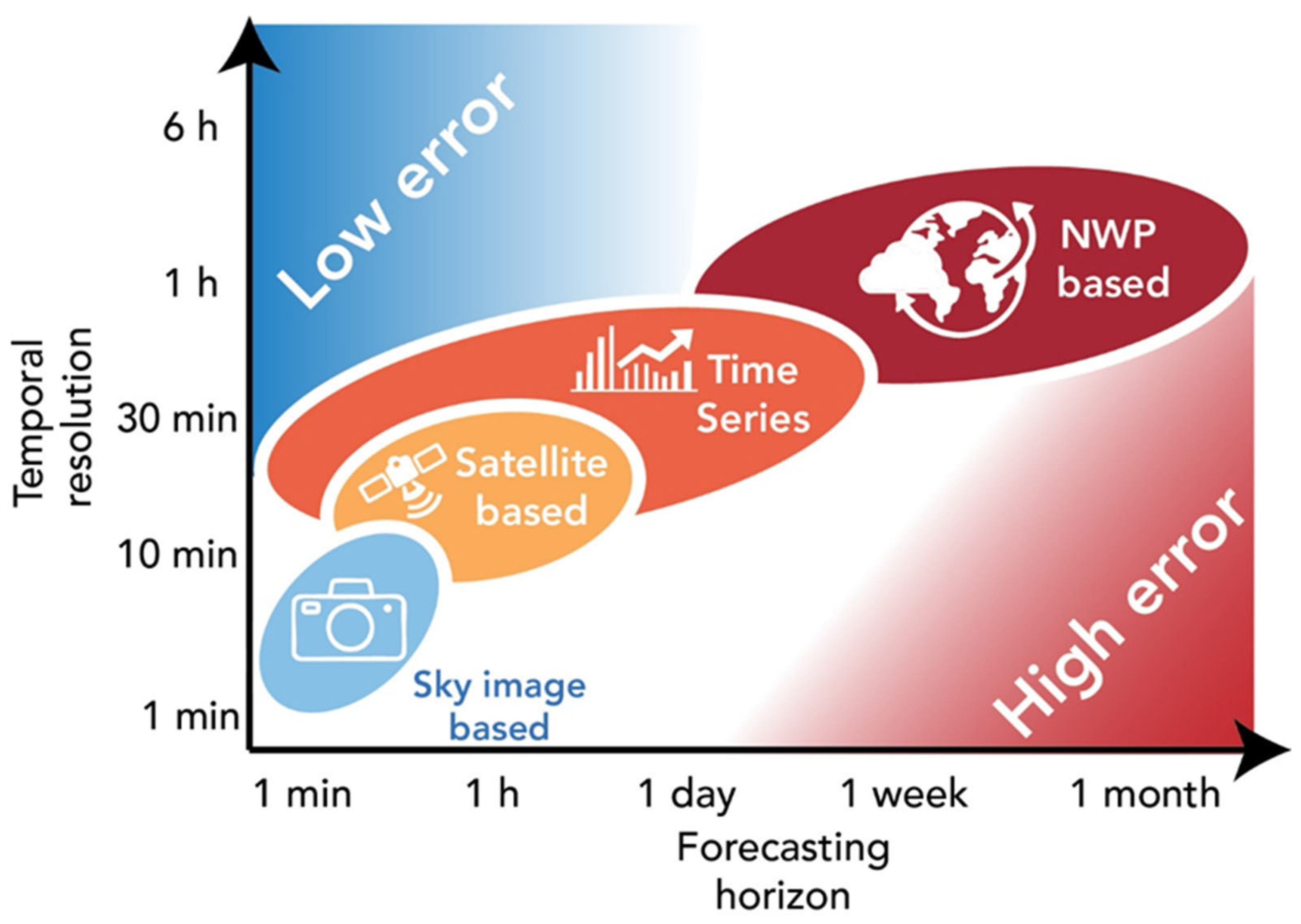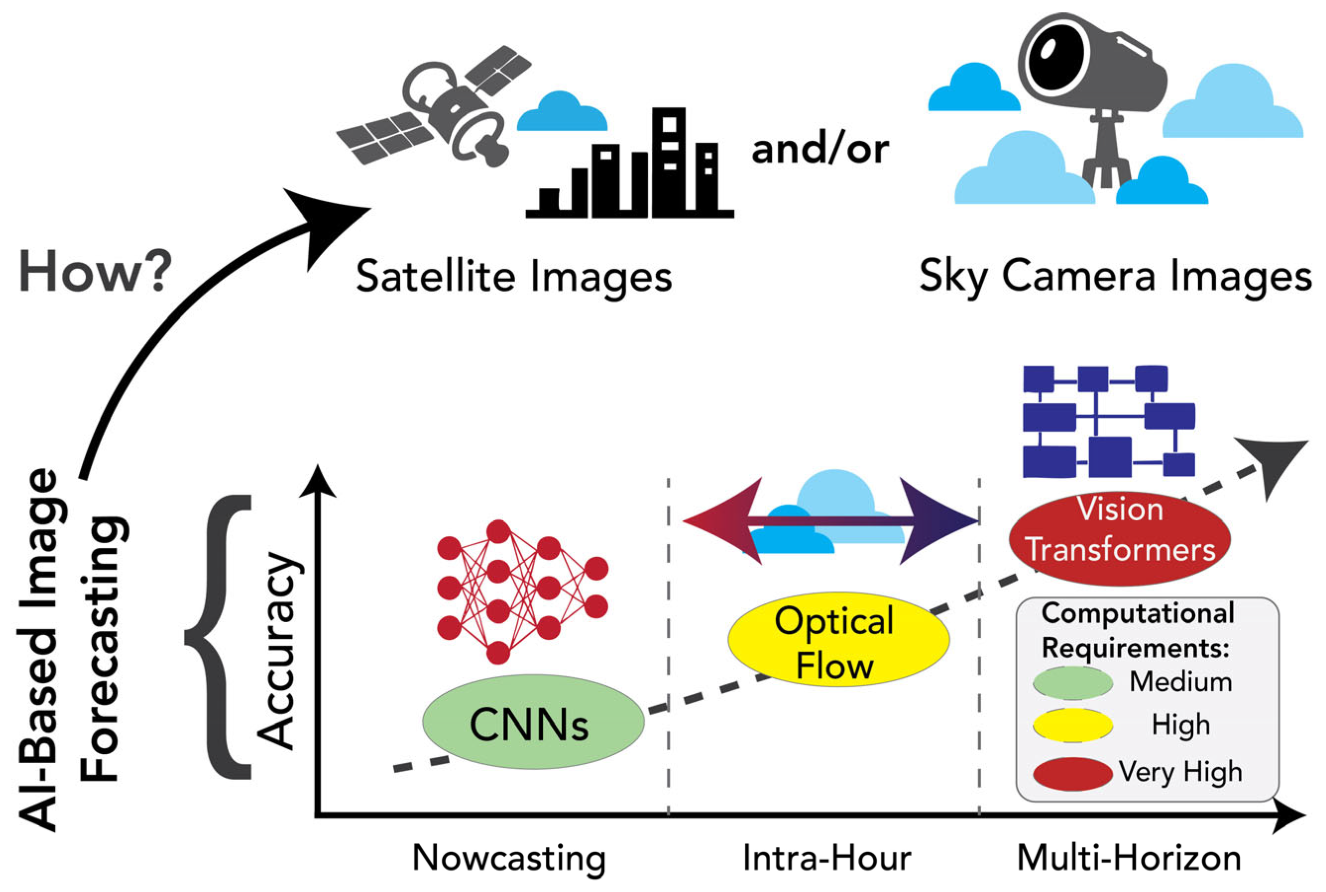 | Spatio-Temporal and Image-Based | CNN, ConvLSTM, optical flow, attention models | Very short-term to intra-hour | Anticipates rapid cloud-driven variability, effective for real-time operation [10,11,12,13,14,15] | High data and computational requirements, sensor-dependent [10,16] | Low (short-term) | High | High |