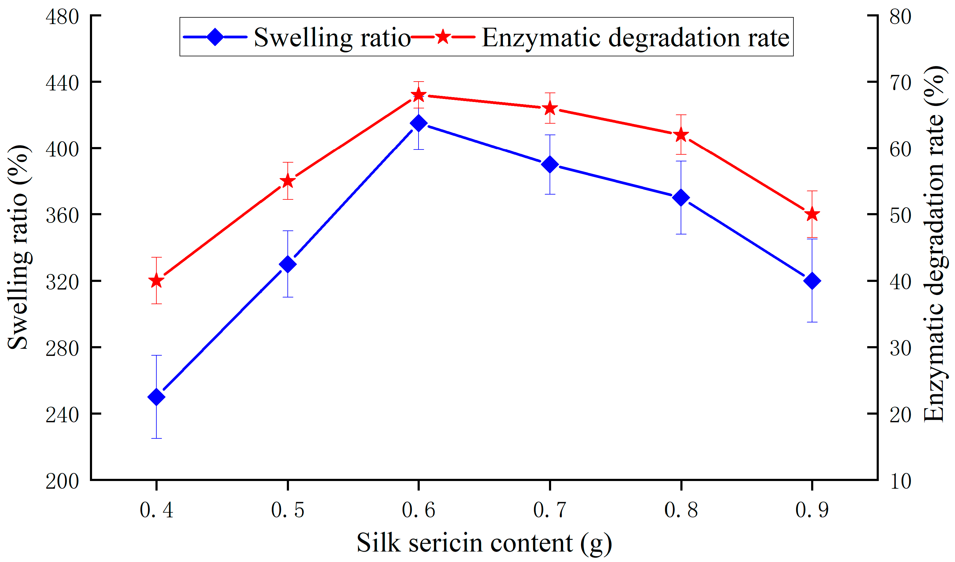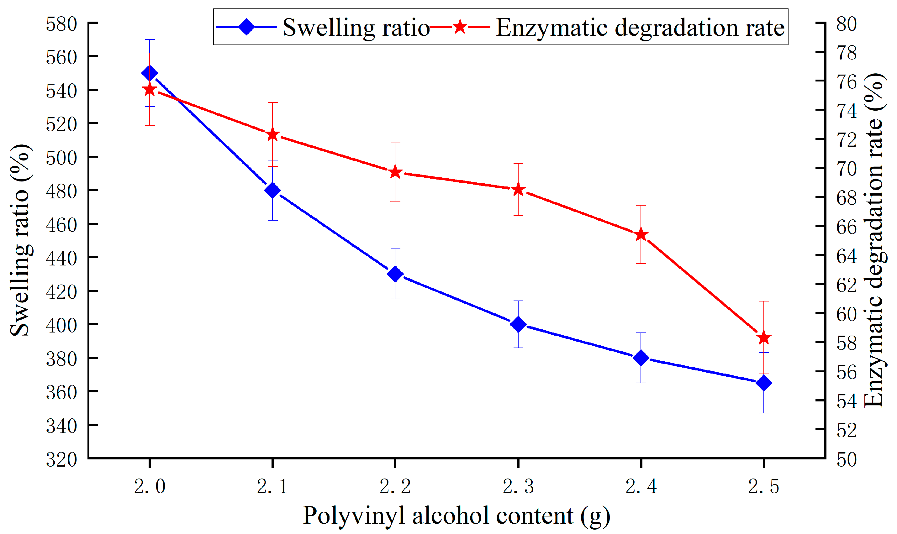 | Poor swelling and degradation performance. Swelling ratio < 400%, enzymatic degradation rate < 65.4% | 0~10 |