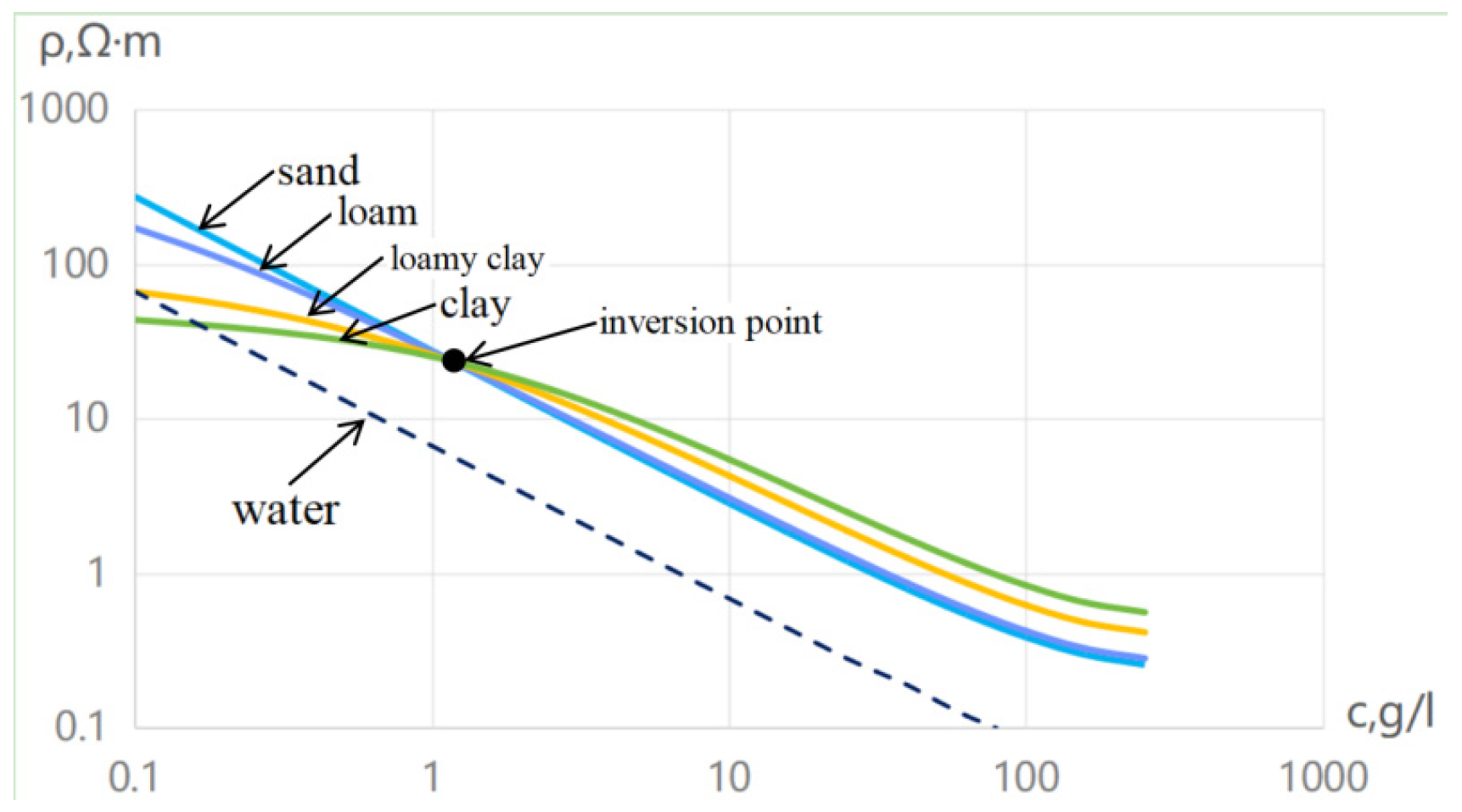 Figure 1 illustrates the dependence of resistivity on pore water mineralization in sandy clay sediments. The curve representing only water resistivity is highlighted with a black dashed line. Under high mineralization conditions, the soil resistivity curve lies above the water line; the magnitude of this vertical offset depends on soil porosity, consistent with Archie’s law. As mineralization decreases, the soil resistivity curve tends to converge with the water line. This convergence is attributed to the dominant influence of the electrical double layer (EDL) effect in clay minerals. The higher the clay content in the soil, the greater the deviation between its resistivity curve and that of the pure sand end-member. As water mineralization increases, the curves for sand and clay intersect at a characteristic resistivity reversal point, after which the resistivity values of both tend to converge. Therefore, the point at which the resistivity of sand changes from being higher than resistivity of clay to being lower than resistivity of clay is called the resistivity reversal point.