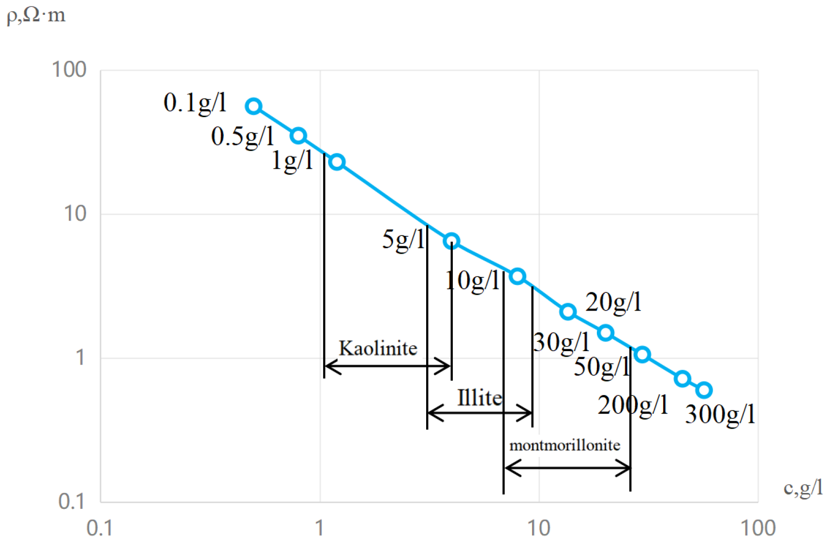 Figure 2, where the characteristic CEC ranges for different clay types are plotted along the reversal point displacement line. This dependence arises because the electrical conductivity of sandy clay sediments is controlled not only by the degree of pore water mineralization but also by the electrical double layer effects at the interface between clay particles and the electrolyte. Crucially, CEC itself contributes significantly to the bulk conductivity. When CEC values approach 200 g/L—characteristic of montmorillonite clays and commonly found in coastal marine muds—the resistivity values of water-saturated clays become substantially less dependent on pore water mineralization (