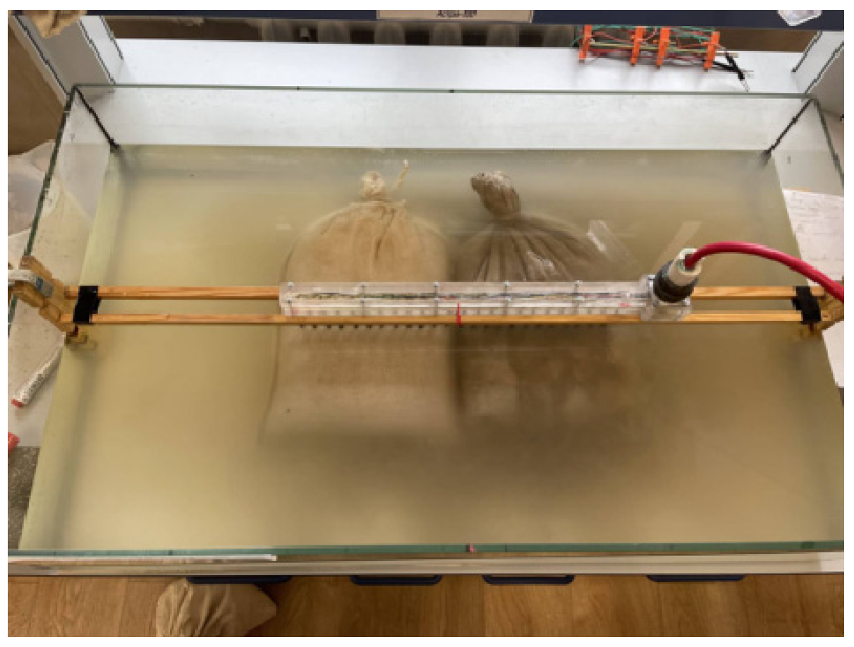Then, based on the volume of distilled water and the desired degree of water mineralization to be simulated, the weight of salt to be added was calculated. The initial mineralization levels of the water were set sequentially as C = 0 g/L, 10 g/L, and 20 g/L. Salt was then added accordingly, and experimental resistivity tomography measurements were carried out.