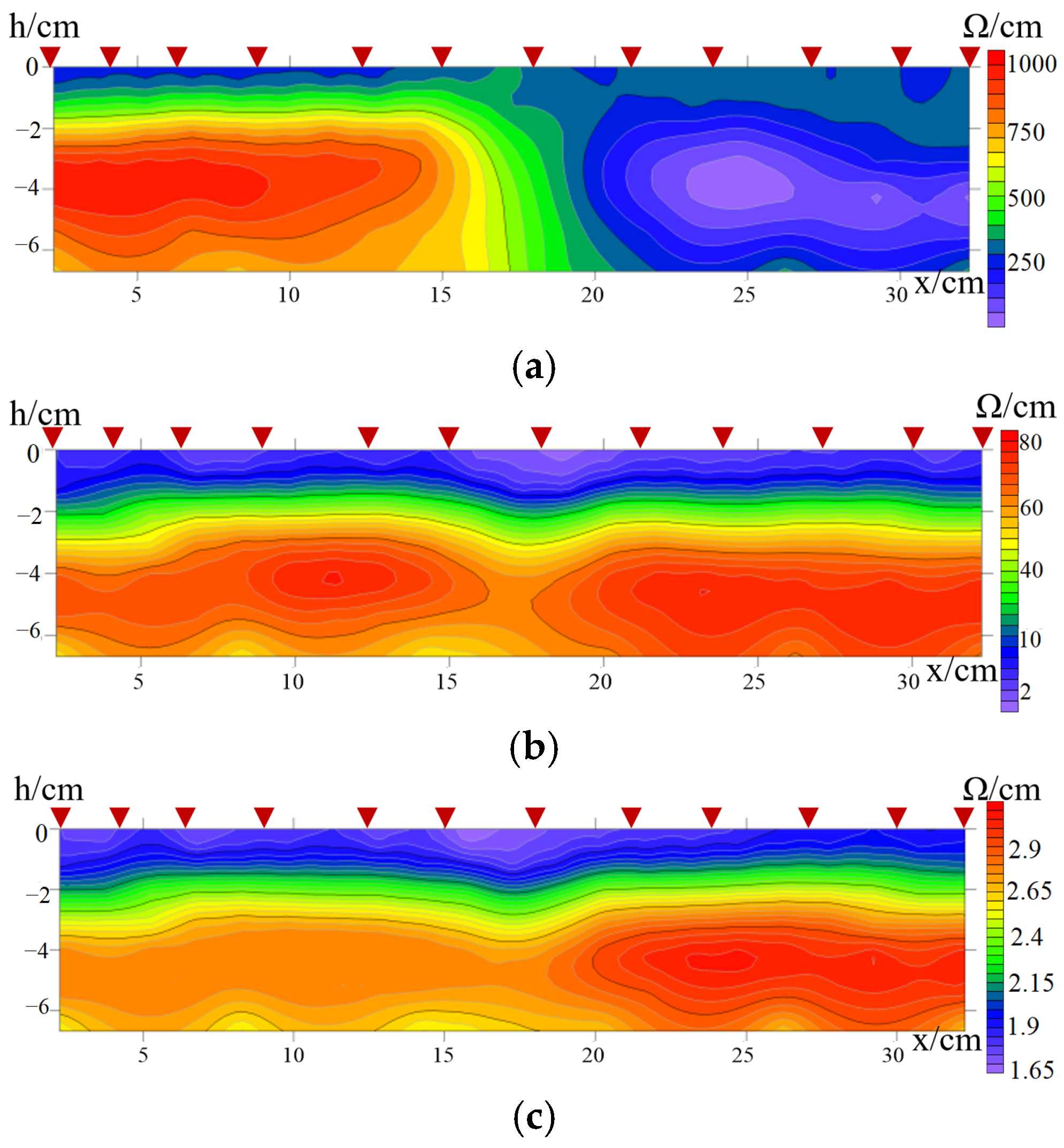 The instrument used was the “SLK-12” 48-channel resistivity tomography system. For precise simulation, only 24 electrodes were used in this experiment. To more closely replicate the acquisition work in actual experiments, the electrodes were immersed in water and coupled with the sample model. Ultimately, the following inversion results were obtained: