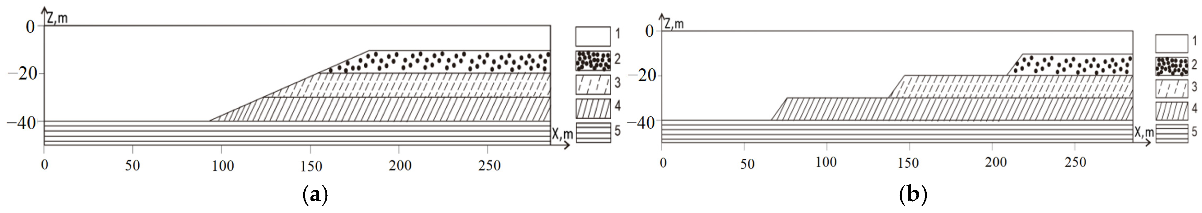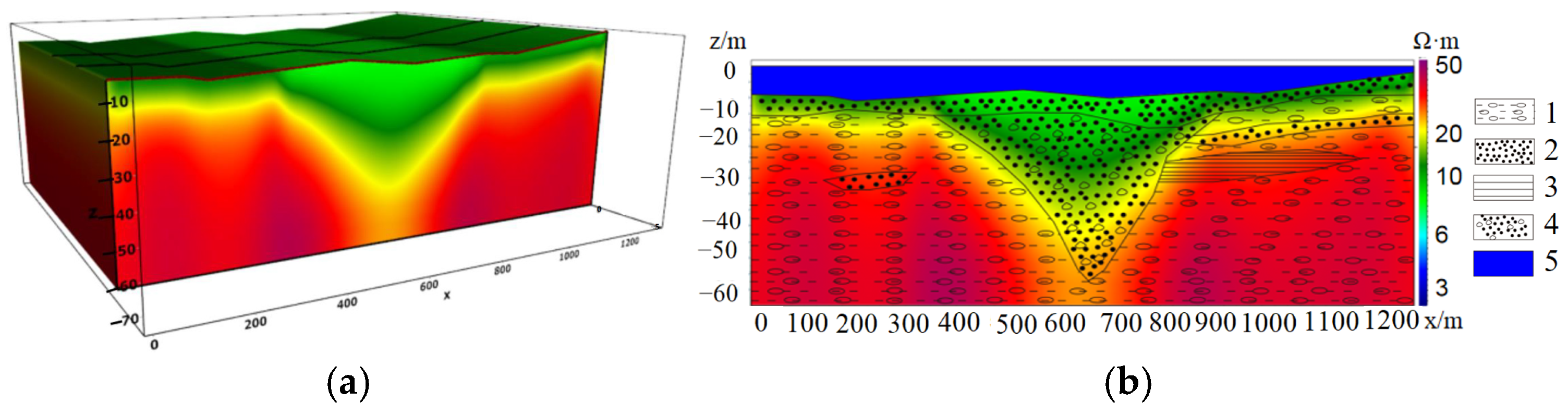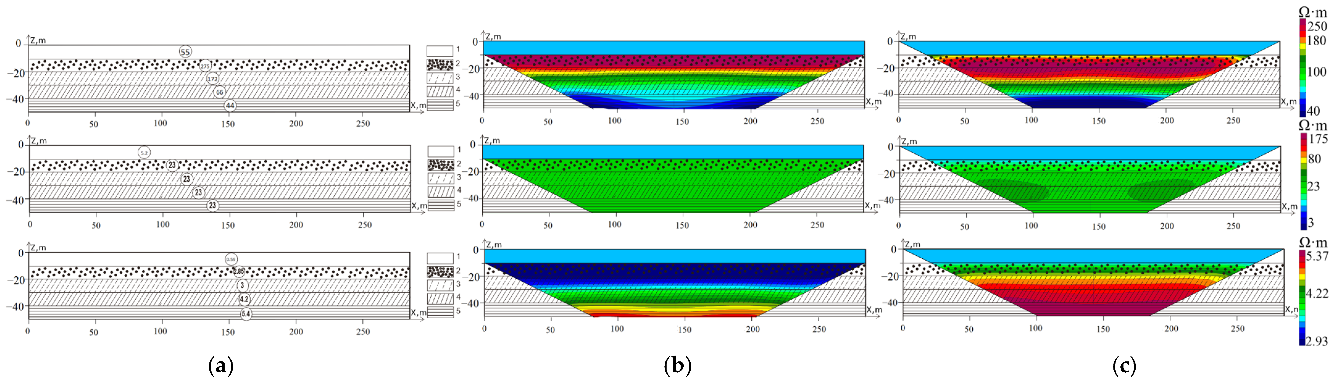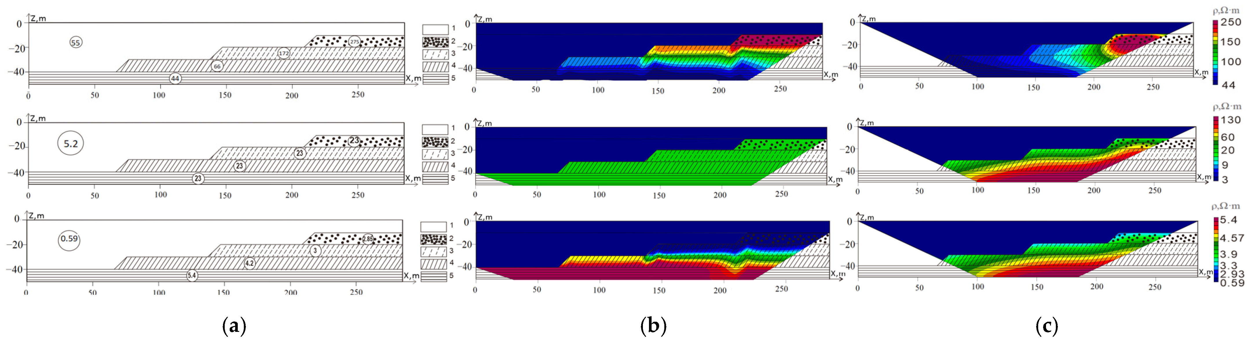 Figure 6a), with a constant water depth. This geoelectric model was selected to estimate results influenced solely by sediment geology and lithology, minimizing distortions caused by seabed topography. Three variants of Model 1 were created, corresponding to water mineralization values (C) of 0.1, 1.29, and 10 g/L (