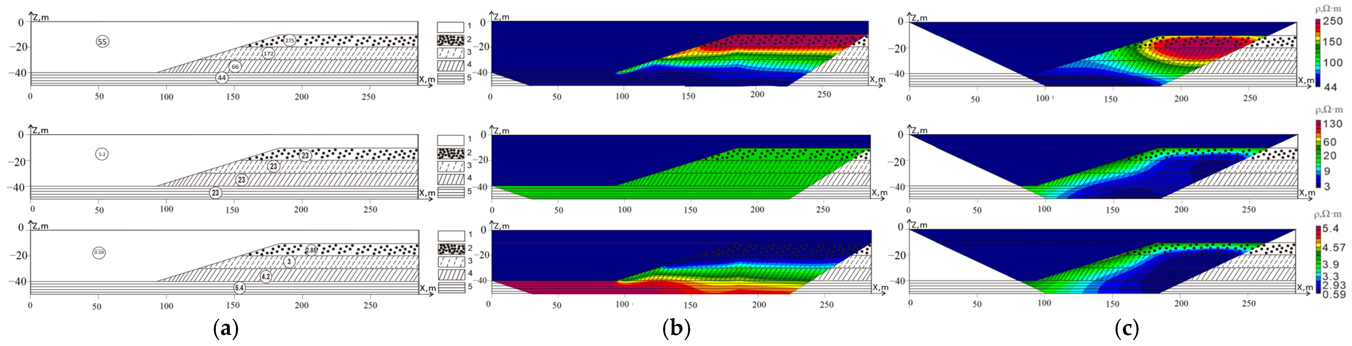 Figure 6a). Their resistivity values were determined based on the results of petrophysical modeling. These C values correspond to the resistivity values of sandy clay rocks recorded at the inversion point and adjacent intervals (