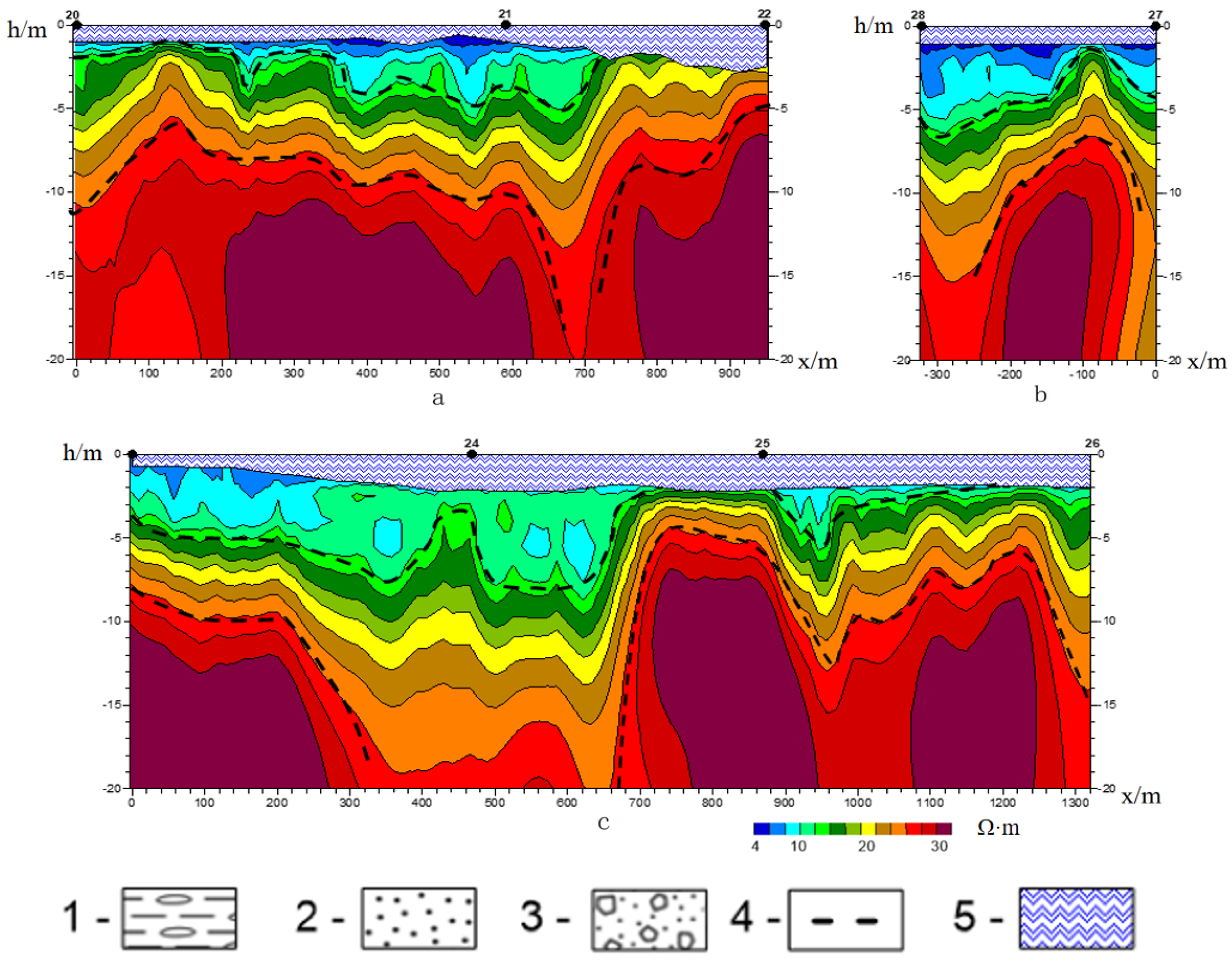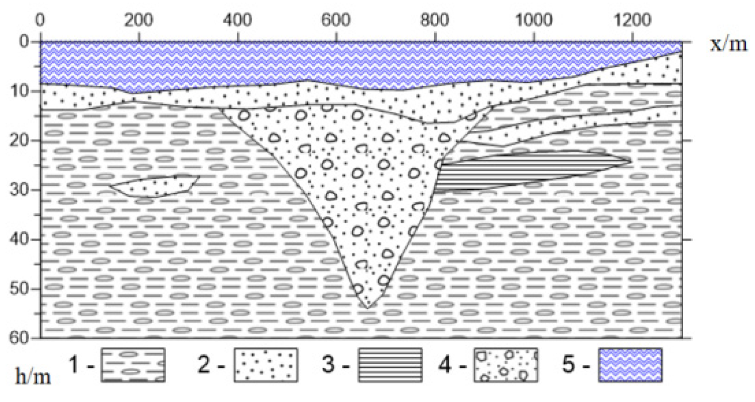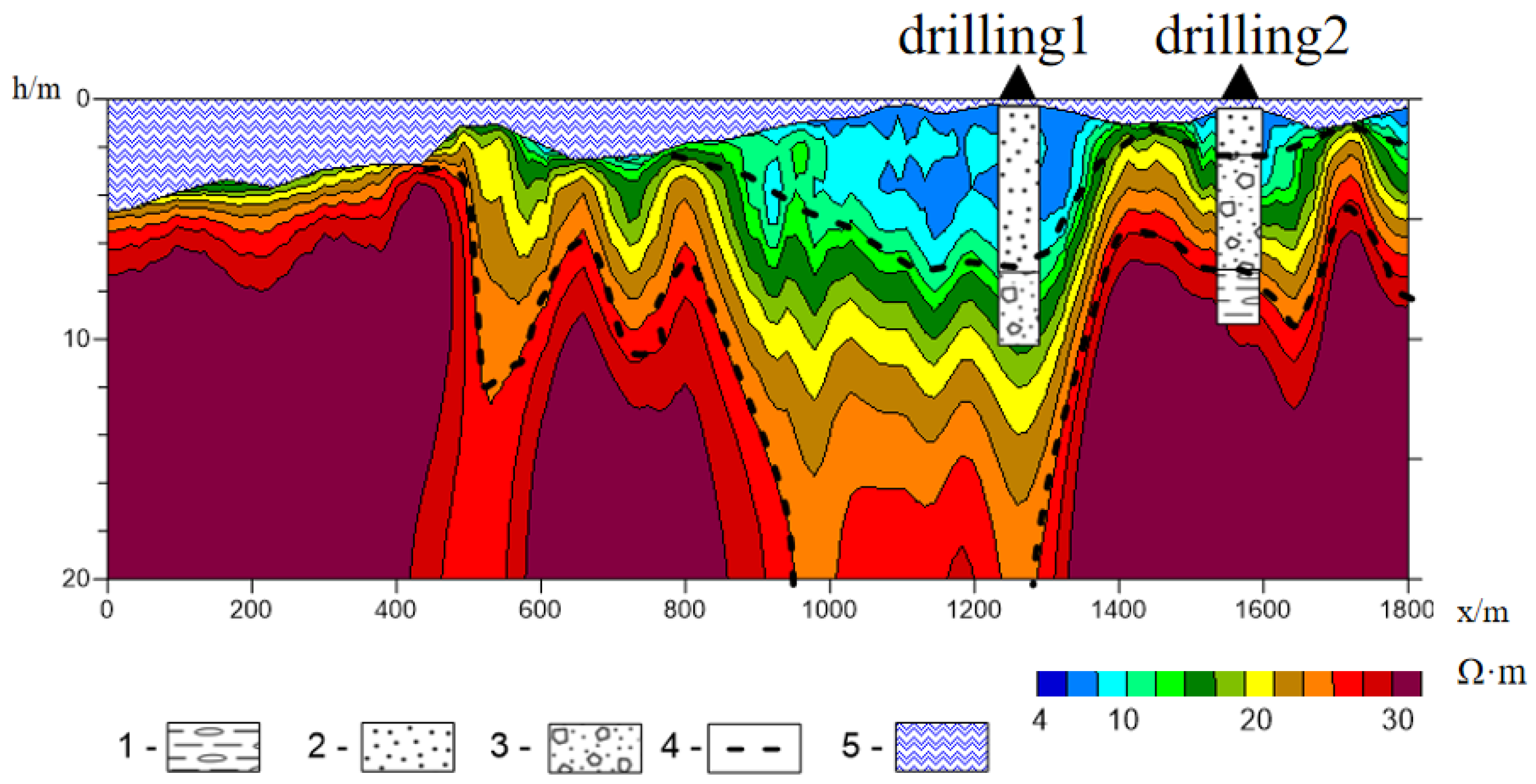 Figure 10: 1. ρ (boulder loam) = 32 Ω·m, 2. ρ (marine sand) = 10 Ω·m, 3. ρ (clay) = 26 Ω·m, 4. ρ (sandy-gravel sediments) = 12 Ω·m, and 5. ρ (water) = 4 Ω·m.