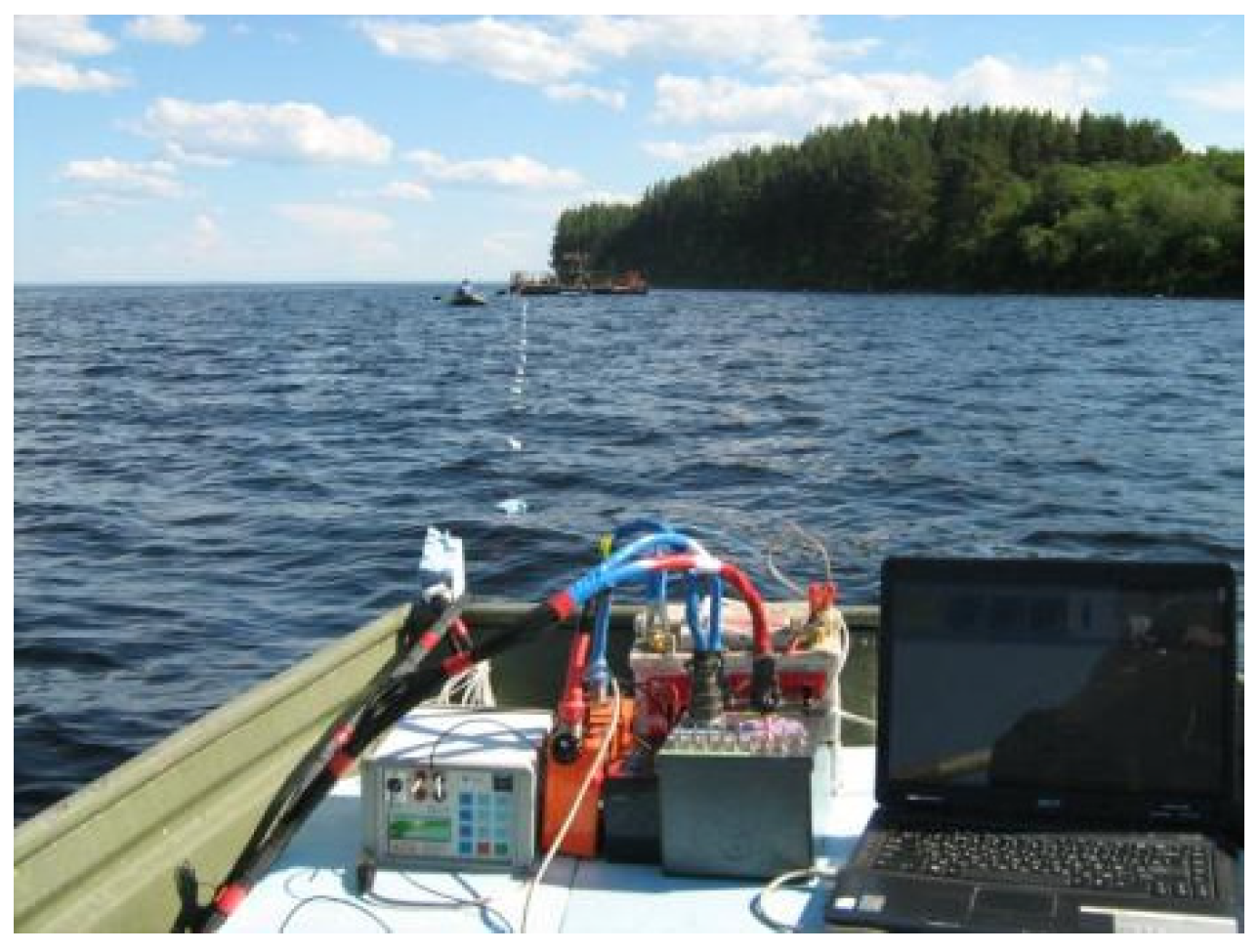 For the processing and interpretation of the experimental data, the X2ipi preprocessing software (ver 6.8) and the ZondRes2D inversion software (ver 2025) were used. The inversion took into account the seabed topography and the resistivity of the water body. According to the resistivity measurement results, the resistivity of the water body ranged from 4 to 5 Ω·m.