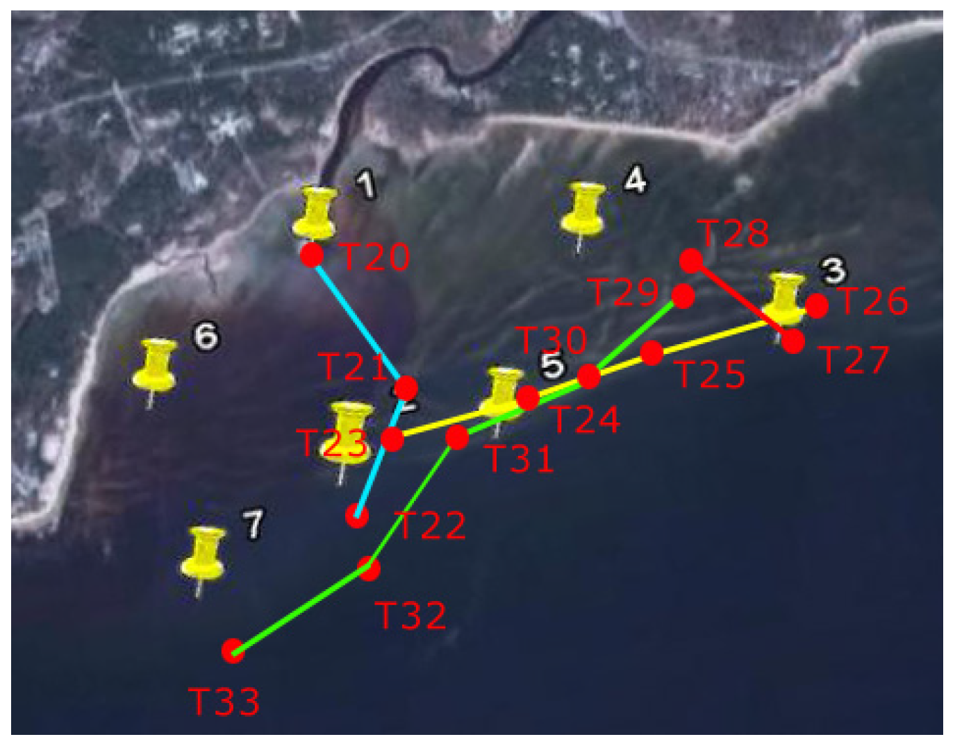 The positioning of the measurement points was determined by the pre-calibrated reference points. Satellite imagery of the study area shows the locations of measurement points T20-T33.