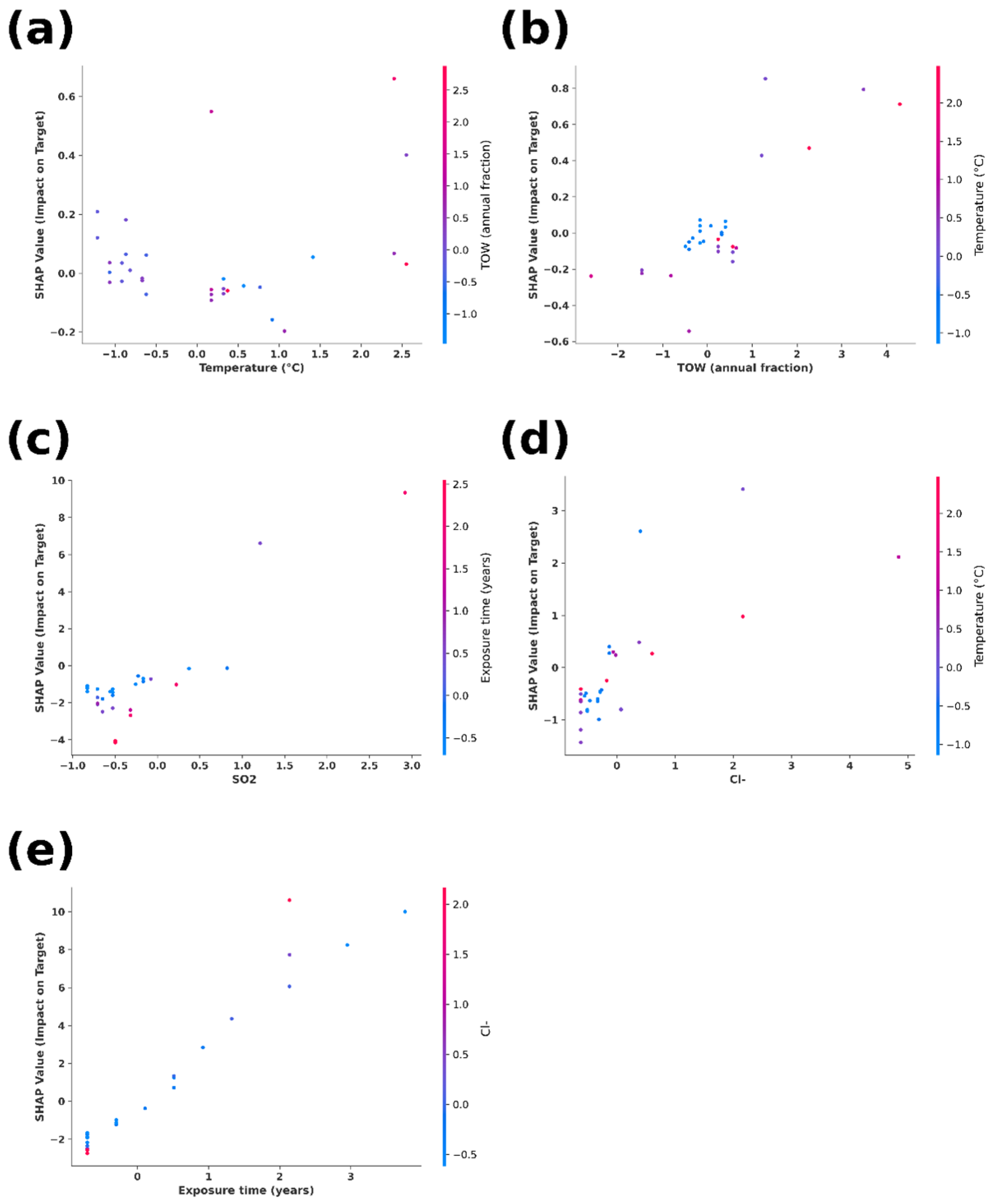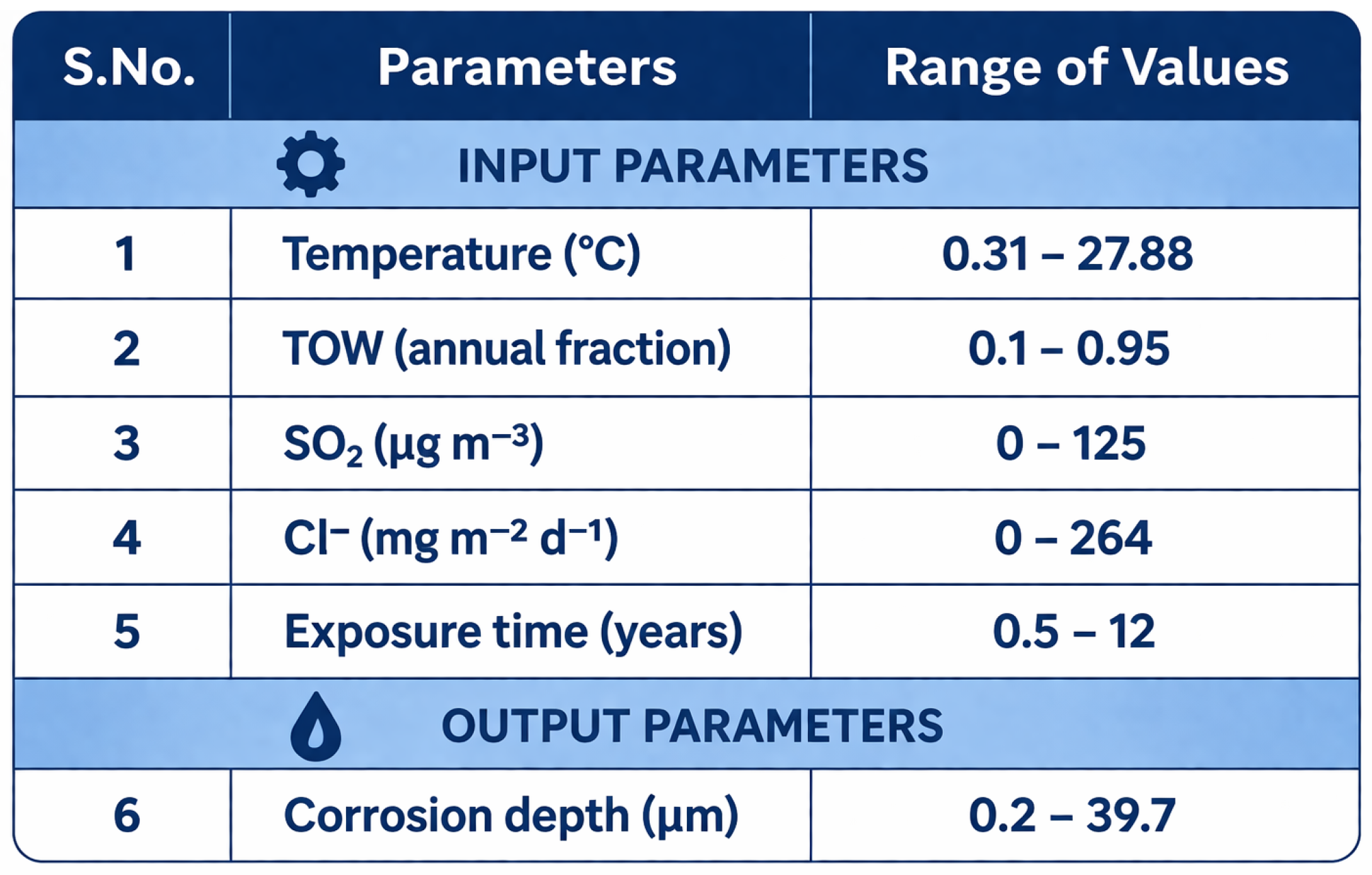 | S.No. | Temperature (°C) | TOW (Annual Fraction) | SO2 | Cl− | Exposure Time (Years) | Exp. Corrosion Depth (µm) | Predicted Corrosion Depth (µm) |