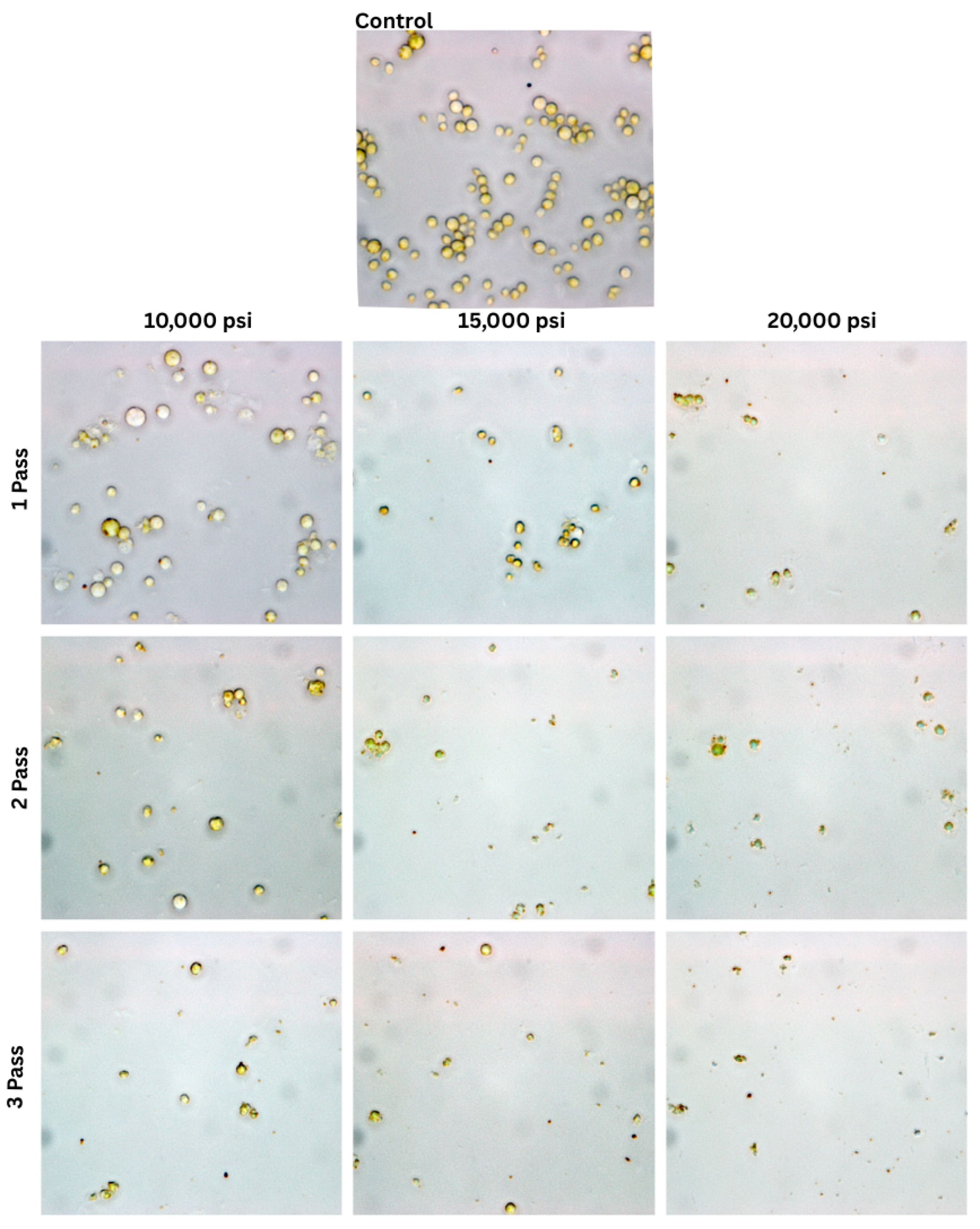 3.1. Microscopic Imaging of HPH-Treated Microalgae