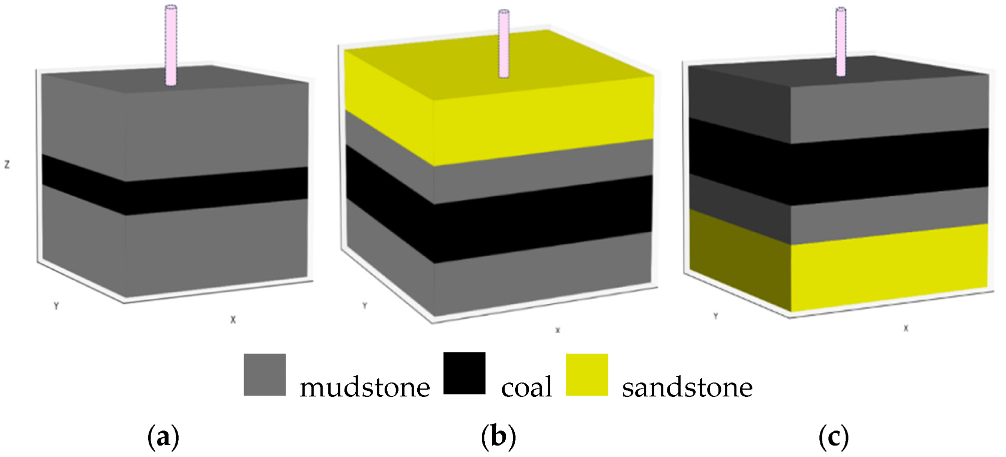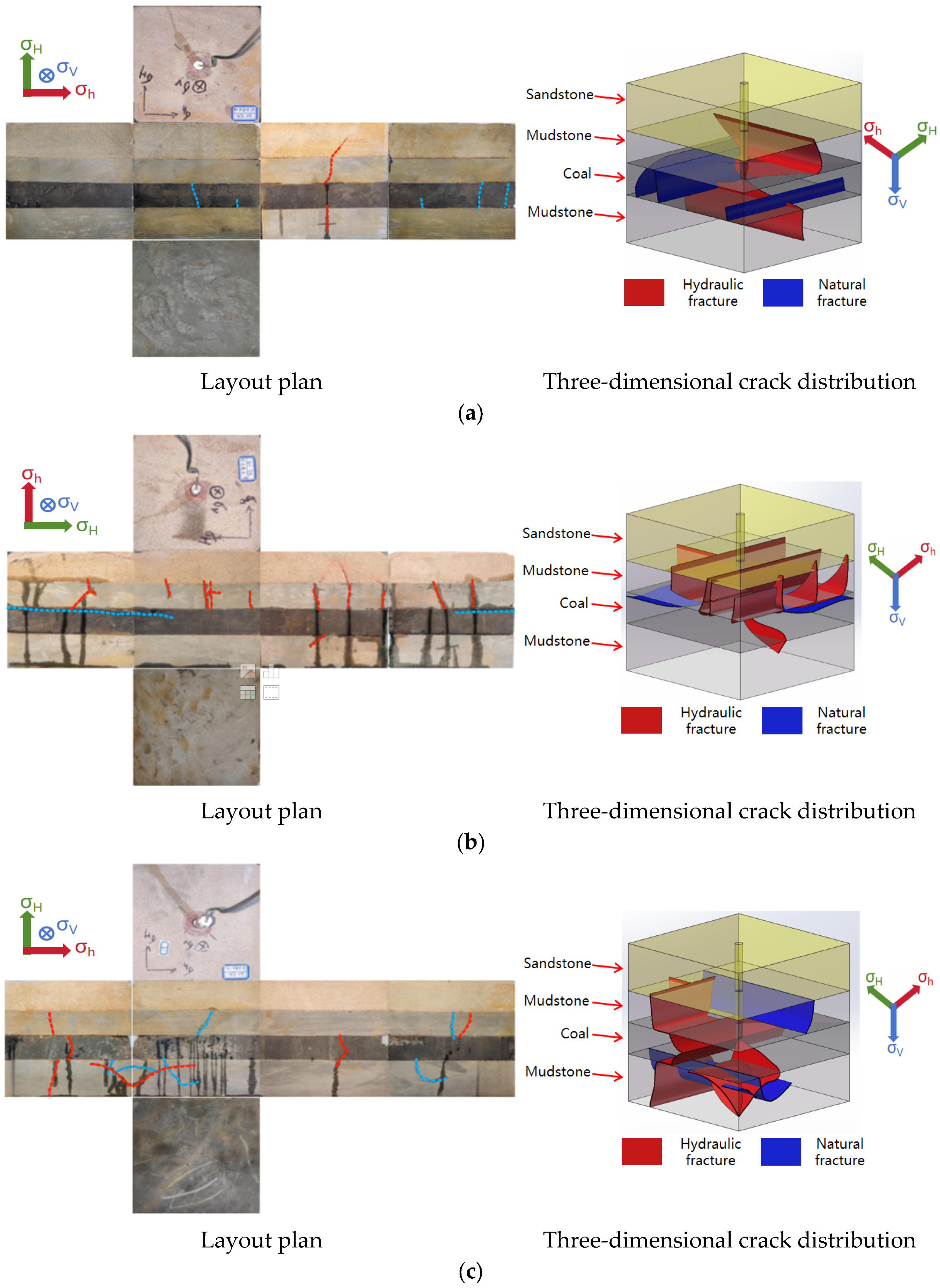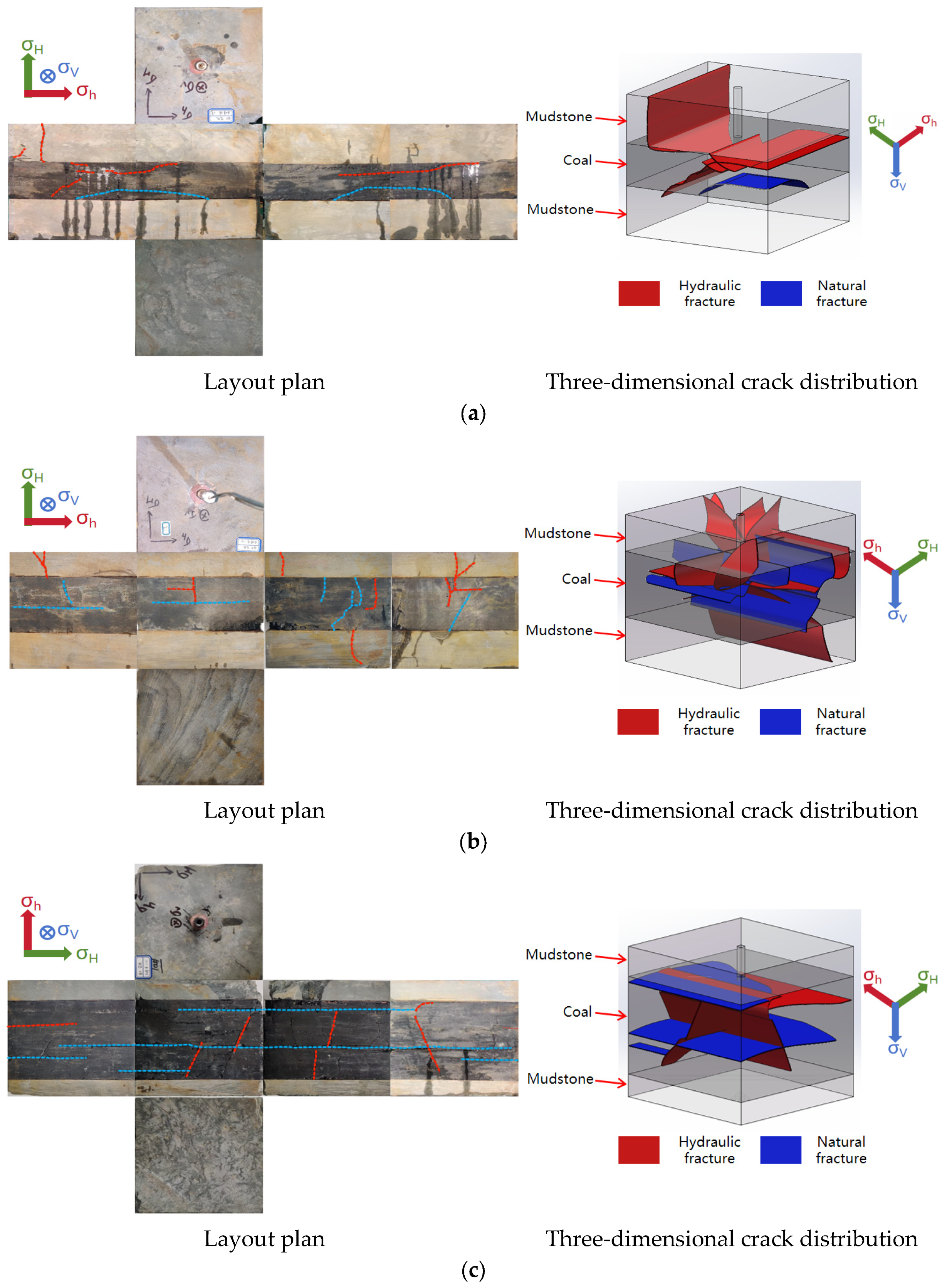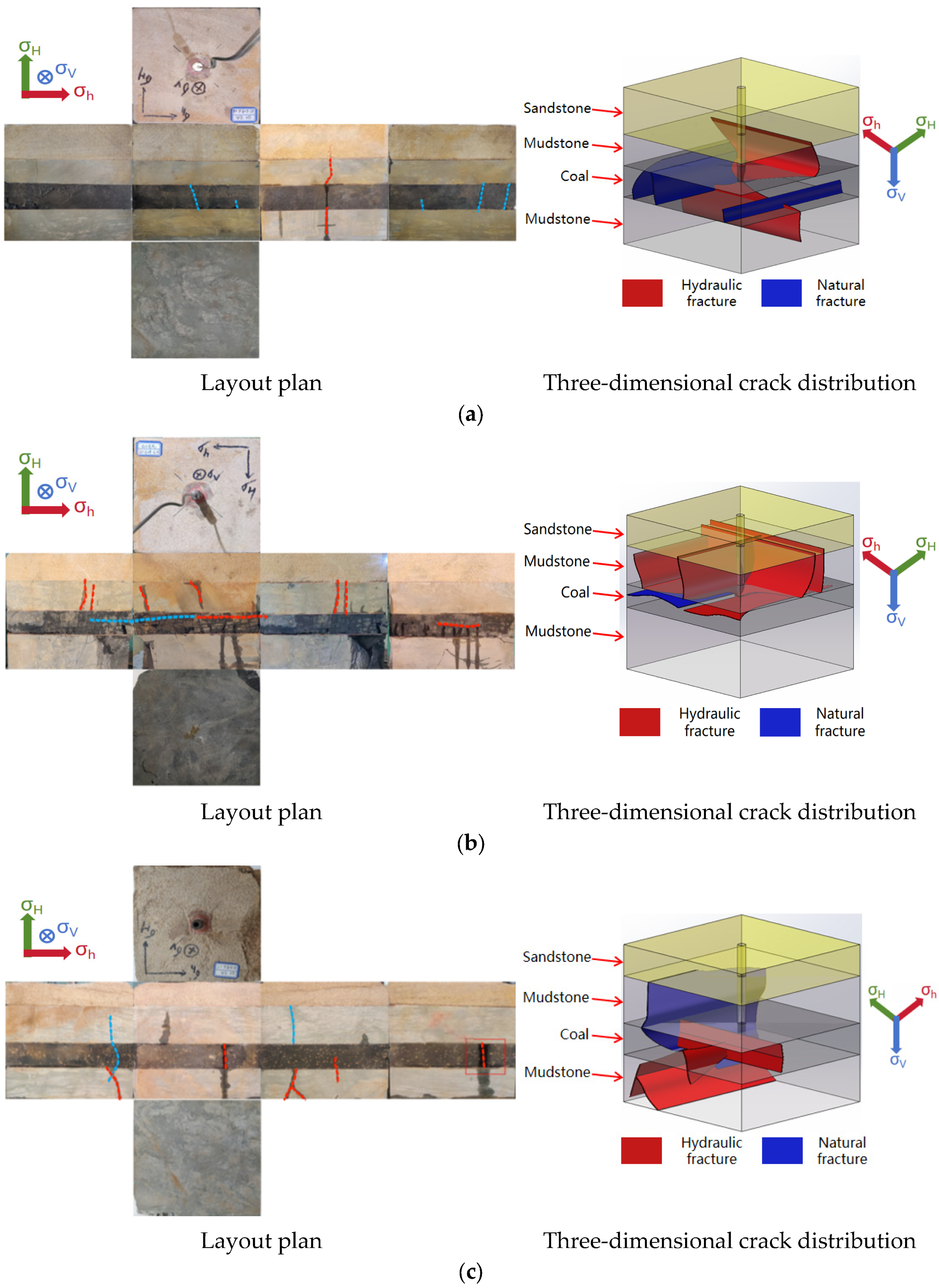 Figure 2. To facilitate accurate analysis of the target parameters, the control variable method was employed in the sample design, resulting in four groups: coal seam thickness group, interlayer thickness group, injection rate group, and fracturing fluid viscosity group. It should be noted that each parameter group contained three parallel specimens. Although the sample size is limited by the difficulty of field sampling, the complexity of multilayer composite-specimen preparation, and the cost of large-scale true triaxial hydraulic fracturing tests, the control-variable design and consistent testing conditions ensure the basic comparability of the results. Basic parameters, such as the three-directional stress (30/26/21 MPa) and the vertical stress difference coefficient (0.43), were fixed, while only the single target parameters were varied. The coal seam thickness was set at 60 mm, 90 mm, and 130 mm; the interlayer thickness was established at 40 mm, 50 mm, and 60 mm; the injection rate was adjusted to 20 mL·min