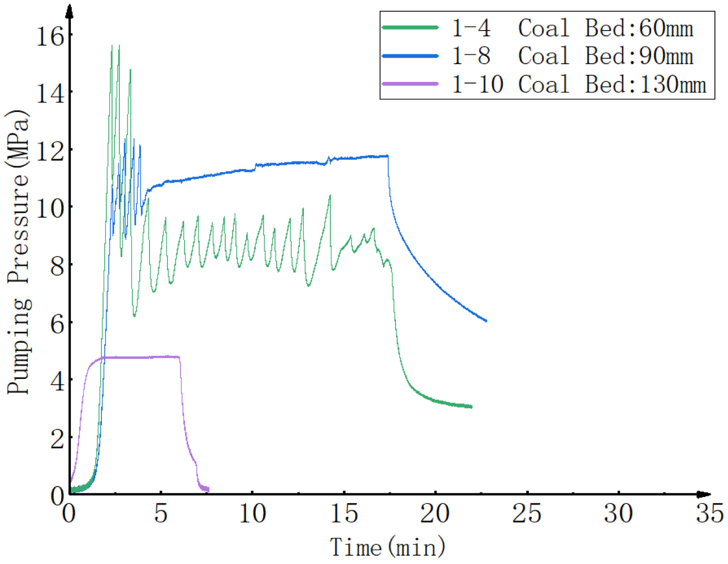 When the coal seam thickness further increases to 130 mm (1–10), the fracturing pressure decreases to 4.5–4.8 MPa, and the platform pressure drops to only 4–5 MPa. In addition, the pressure decays rapidly after pump shut-down. This behavior can be attributed to the fact that the thicker coal seam provides a larger in-seam propagation space for hydraulic fractures. As a result, the fracturing fluid is distributed along a longer fracture-flow path and diffuses more easily into the natural fracture system, which enhances pressure attenuation along the flow path. Consequently, it becomes difficult to maintain and concentrate the net pressure at the fracture tip, leading to a significant reduction in the overall pump-pressure level. Overall, the pump-pressure curve indicates that the platform pressure first increases and then decreases with increasing coal seam thickness, and the curve pattern changes from a relatively stable response under the medium-thickness condition to a low-platform characteristic under the thick coal seam condition.
