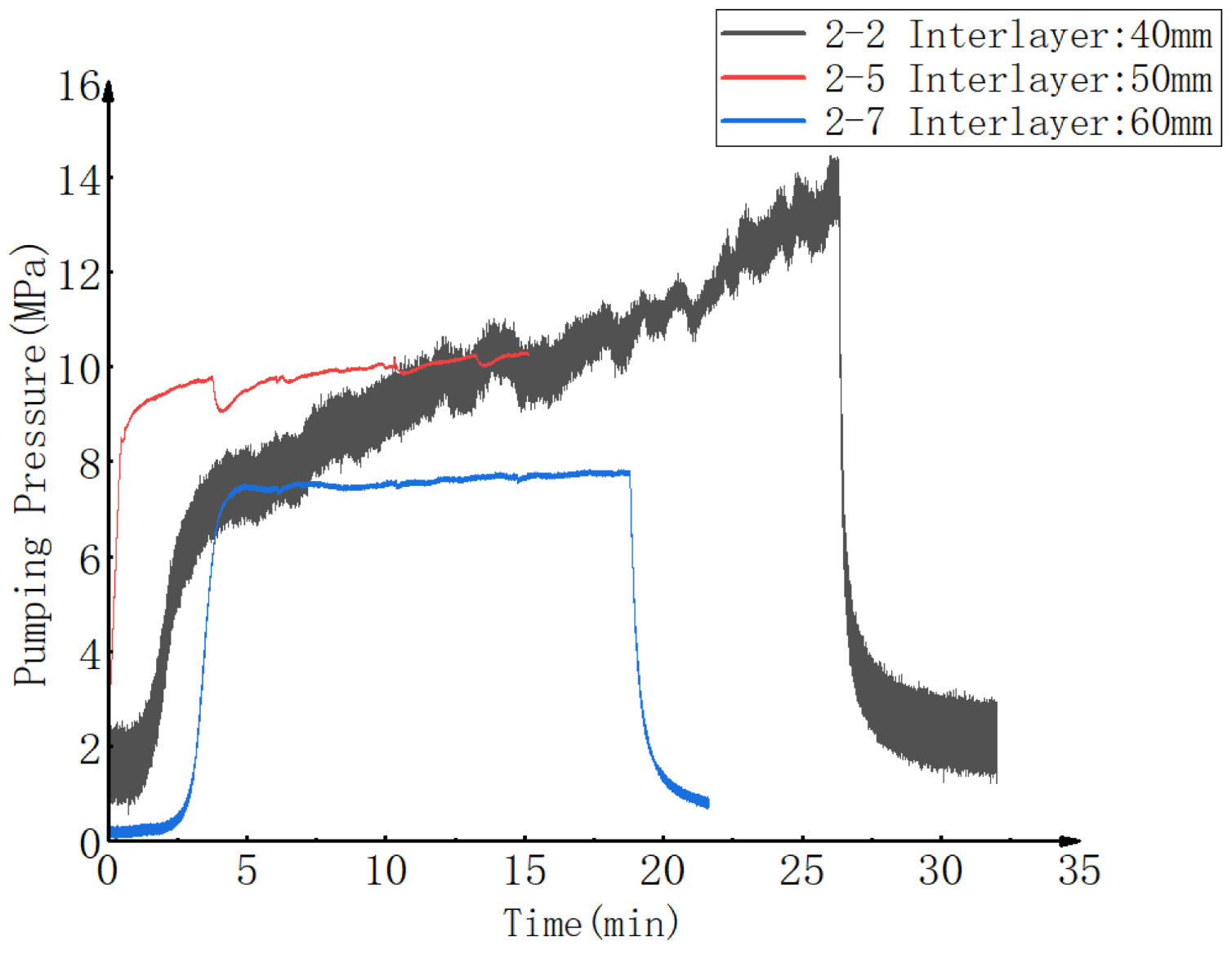 Figure 6, when the interlayer thickness increases from 40 to 60 mm, the platform pressure exhibits a non-monotonic variation with interlayer thickness. When the interlayer thickness is 40 mm (2-2), the fracturing pressure is approximately 8 MPa, and no stable pressure plateau is formed during the propagation stage. Instead, the pressure continues to rise with time and reaches about 14–15 MPa before pump shut-down. Under this condition, the hydraulic fractures are able to penetrate the interlayer and increase fracture height, while the newly created fracture volume is continuously filled with fracturing fluid. Under a constant injection rate, the driving pressure required to sustain fracture propagation increases as the fracture surface area expands, resulting in a continuous rise in pump pressure.
