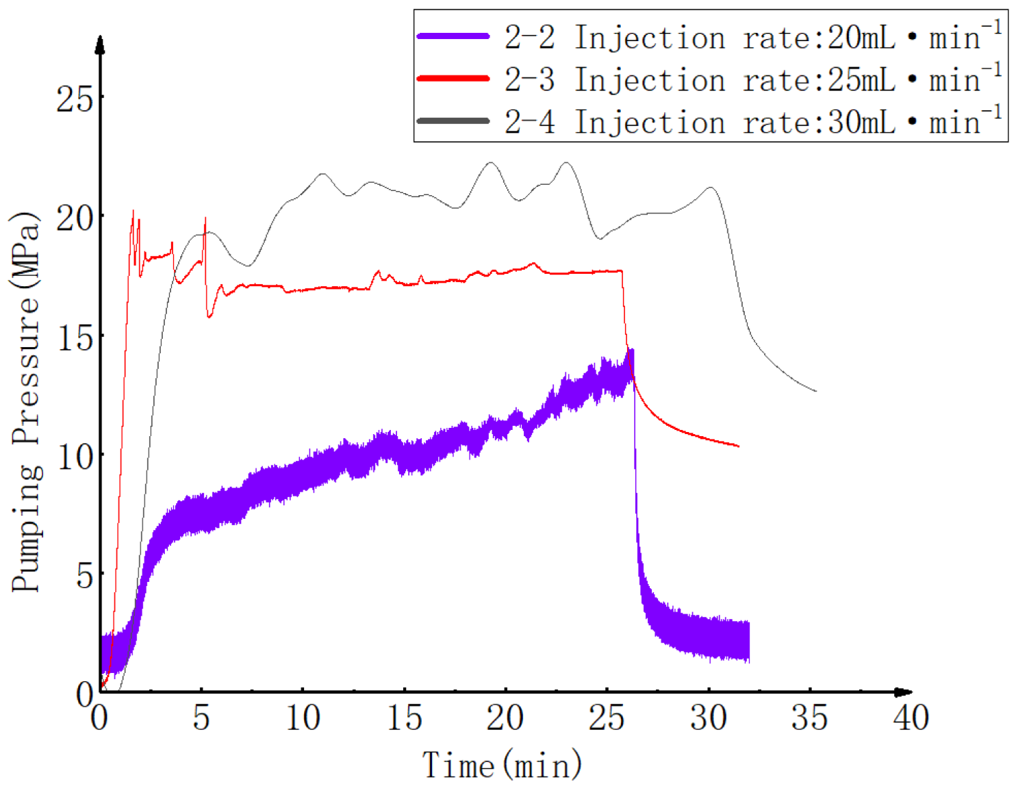 When the injection rate is further increased to 30 mL min−1 (2–4), the fracturing pressure reaches approximately 18–19 MPa, while the platform pressure increases to 20–22 MPa. The higher injection rate enhances pressure concentration at the fracture tip and generates a relatively high driving pressure before the fracture volume expands significantly, thereby maintaining a higher platform-pressure level. Overall, as the injection rate increases from 20 to 30 mL min−1, the platform pressure increases correspondingly, and the pump-pressure curve gradually changes from a progressive rising response to a high-platform response.