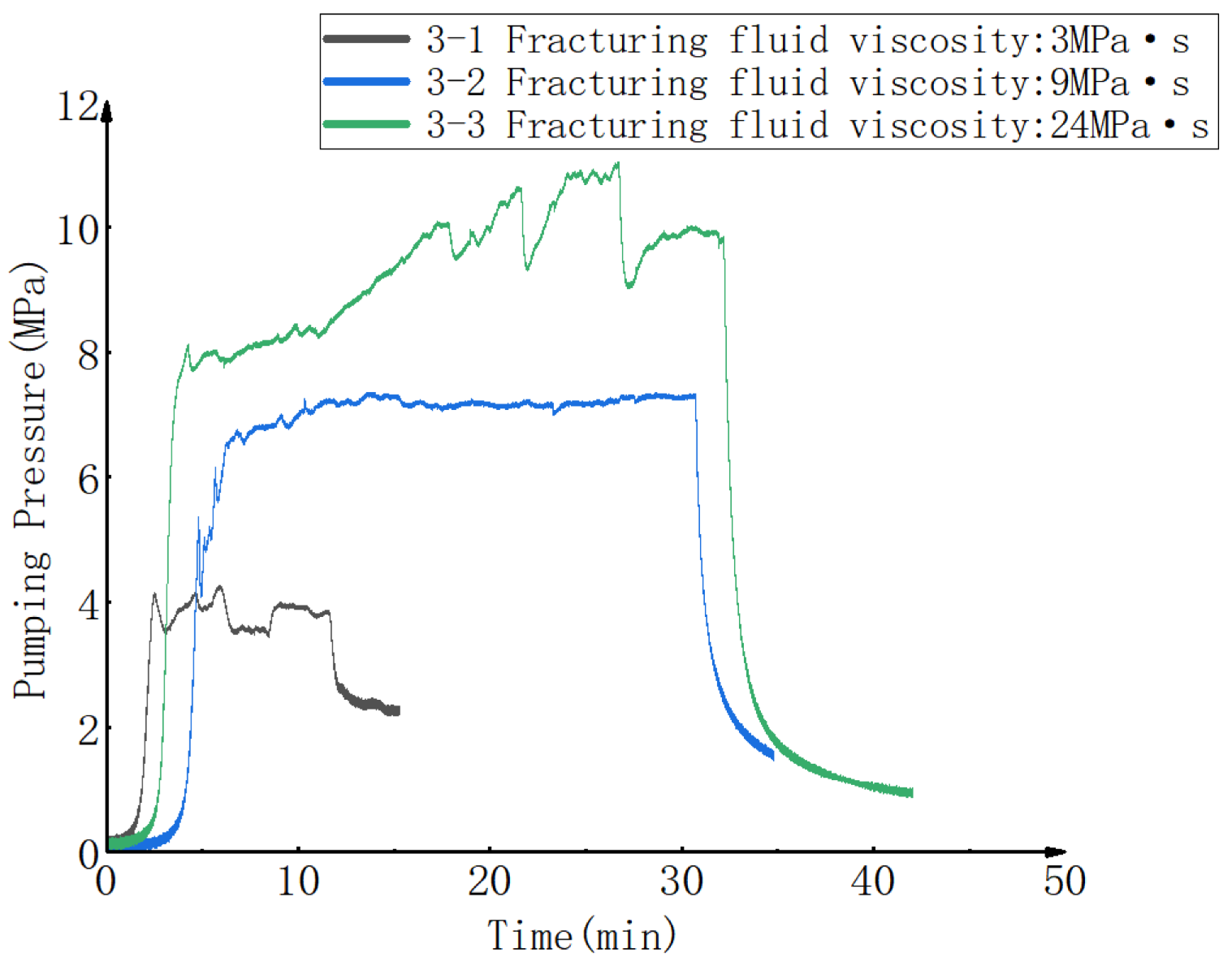 Figure 10, when the fracturing-fluid viscosity is 3 mPa·s (3–1), the fracturing pressure is approximately 4 MPa, and the pressure remains at 3–4 MPa during the propagation stage, resulting in the lowest overall pump-pressure level, with no obvious pressure plateau. Under the low-viscosity condition, the fracturing fluid can more easily penetrate into the coal seam and interfacial fracture system and diffuse along natural fractures and bedding planes. As a result, the net pressure within the fracture decays significantly, making it difficult to maintain a stable driving pressure at the fracture tip and thereby limiting the platform-pressure level.