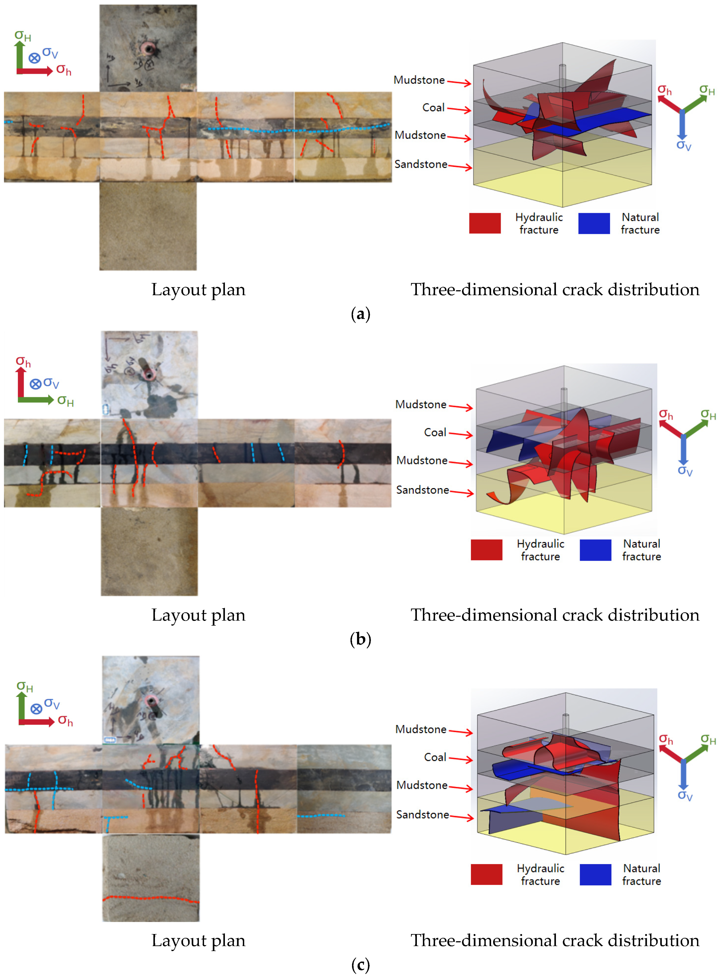 True triaxial hydraulic fracturing physical simulation tests were carried out under constant conditions of lithologic composition (sandstone layer–mudstone interlayer–coal seam–mudstone layer), layer thickness (60–40–40–60 mm), three-directional stress, and fracturing-fluid viscosity. The only variable was the injection rate (20, 25, and 30 mL min