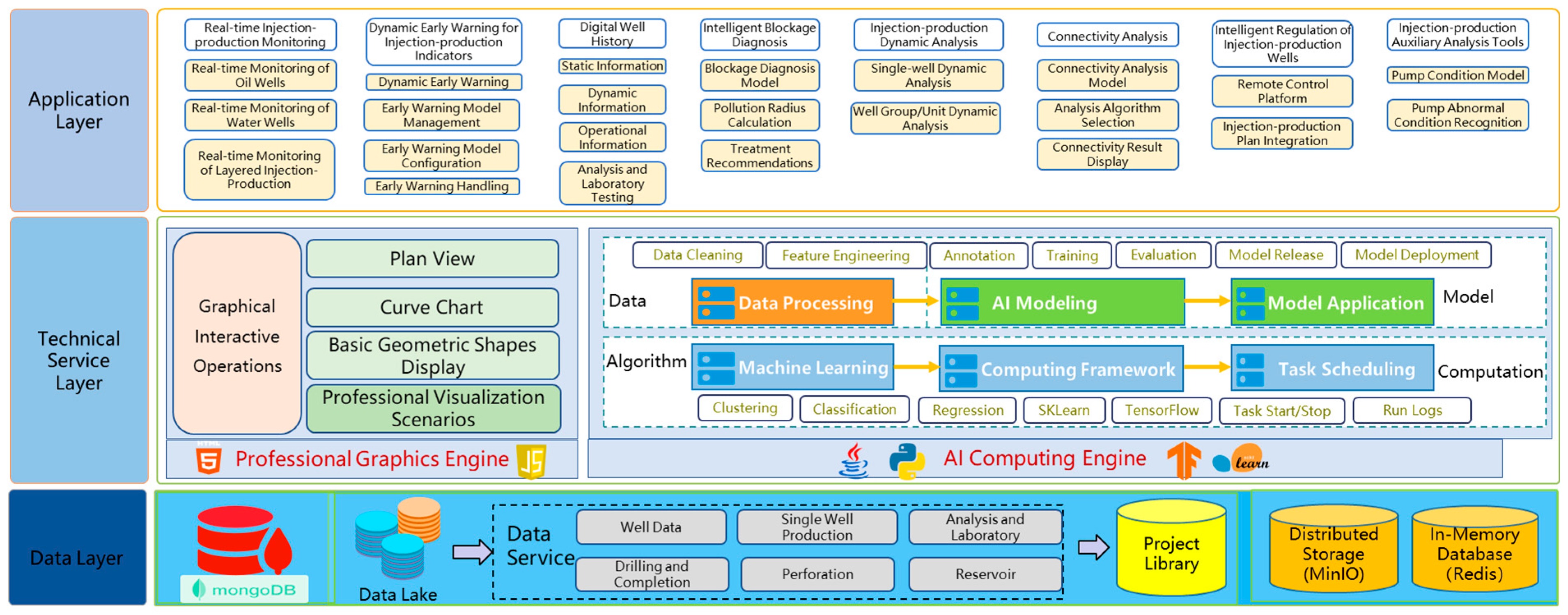 - Technical Service Layer: This layer utilizes three public services from the oilfield cloud platform: user service, permission service, and log service. Serving as the intelligent core of the system, the technical service layer comprises two key components: first, the AI computing engine, which integrates various machine learning algorithms such as clustering, classification, regression, SKLearn, and TensorFlow within the algorithm model service; second, the professional graphics engine, which implements basic geometric visualization and specialized visual scenario business rules through the graphic interaction operation service.