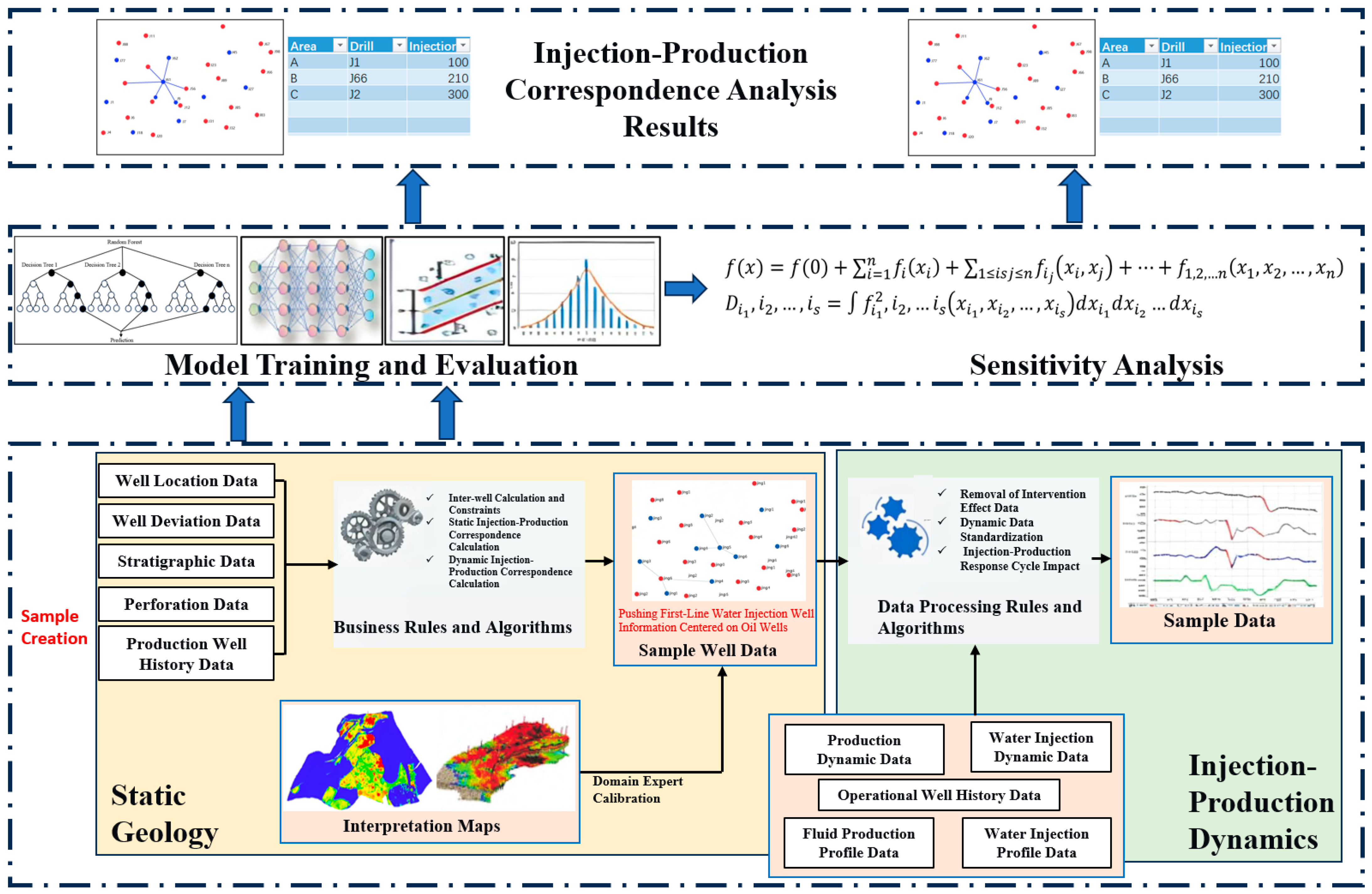 - The static–dynamic integrated Bayesian framework enables probabilistic quantitative characterization of injector–producer connectivity. To address the dual challenges of subjectivity in static geological interpretation and uncertainty in dynamic production responses, a connectivity quantitative evaluation method integrating Sobol global sensitivity analysis with Bayesian inference was established. Static geological information—such as fault seal capacity and sandbody connectivity—is quantified as probabilistic prior distributions, while dynamic production responses serve as the likelihood function. Through Bayesian updating, rigorous propagation and fusion of uncertainty are achieved. Sensitivity analysis shows that when dynamic evidence is strong, the posterior probability converges toward the dynamic indication, effectively overcoming prior subjectivity; when dynamic evidence is weak, the posterior retains a wide distribution, providing users with a quantified risk warning. This method achieved an identification accuracy of 85% across 32 well pairs in Oilfield B, significantly outperforming single-method analyses.