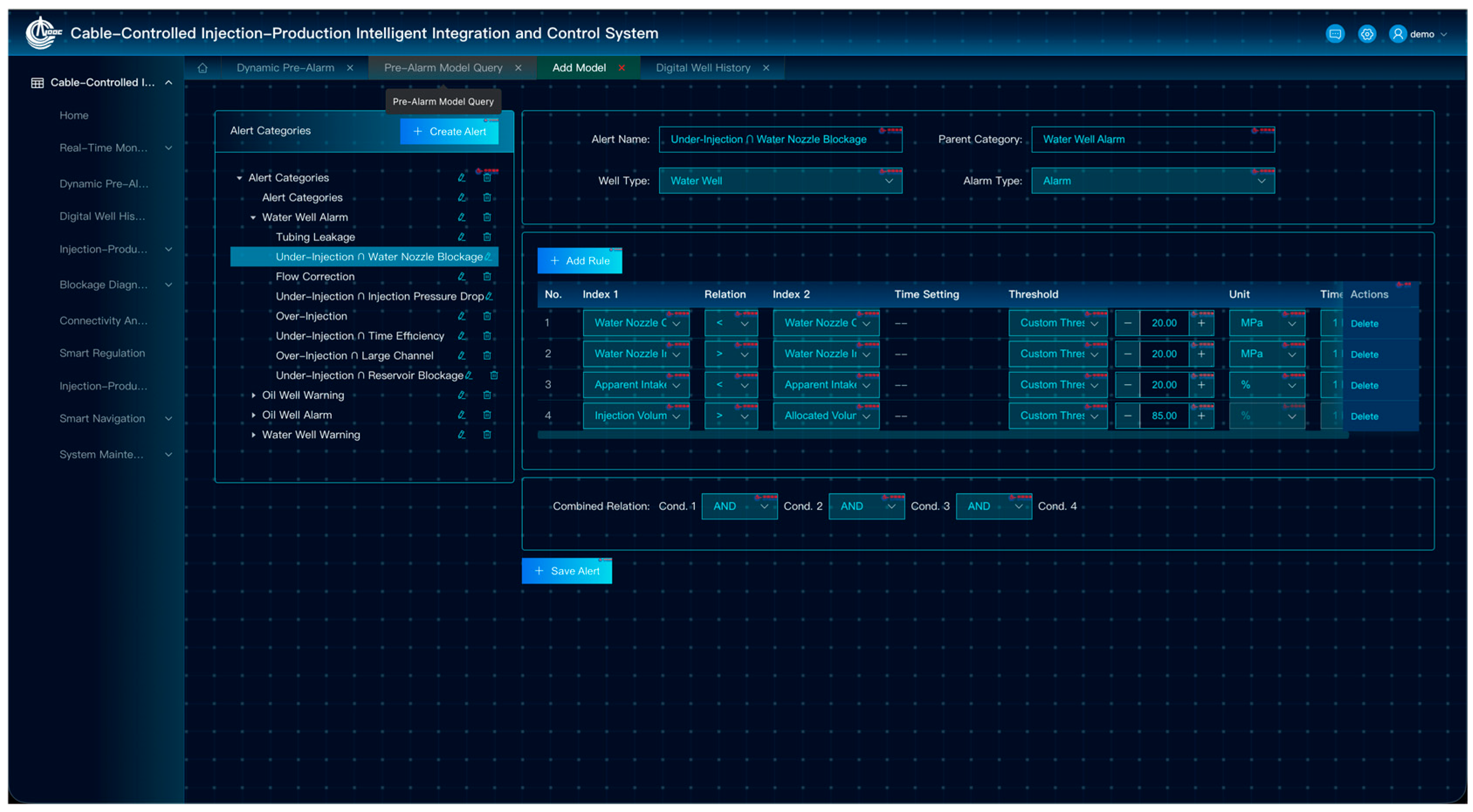 - Application Layer: The presentation method is web-based, utilizing technologies such as JavaScript, Vue, and HTML5. The client requires Internet Explorer 10 or above, or a browser based on the Chrome kernel. This layer provides a user-friendly interface for end-users, ensuring a seamless experience across different terminal devices. The application layer implements nine functional modules: real-time injection–production monitoring, dynamic pre-alarming, digital well history, blockage diagnosis, injection–production dynamic analysis, connectivity analysis, intelligent regulation, auxiliary analysis tools, and system management. Each functional module adopts a component-based design, allowing for flexible configuration based on user requirements.