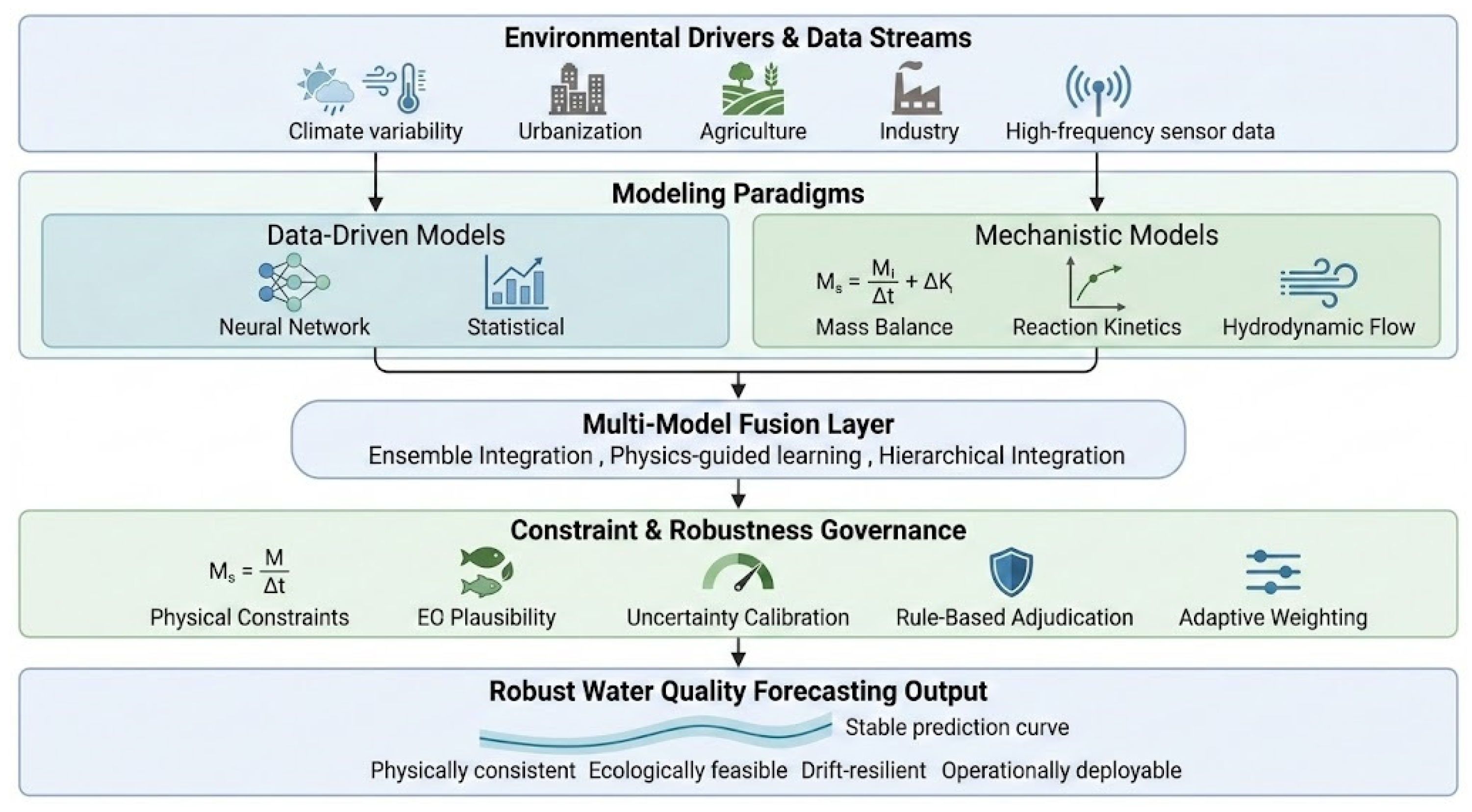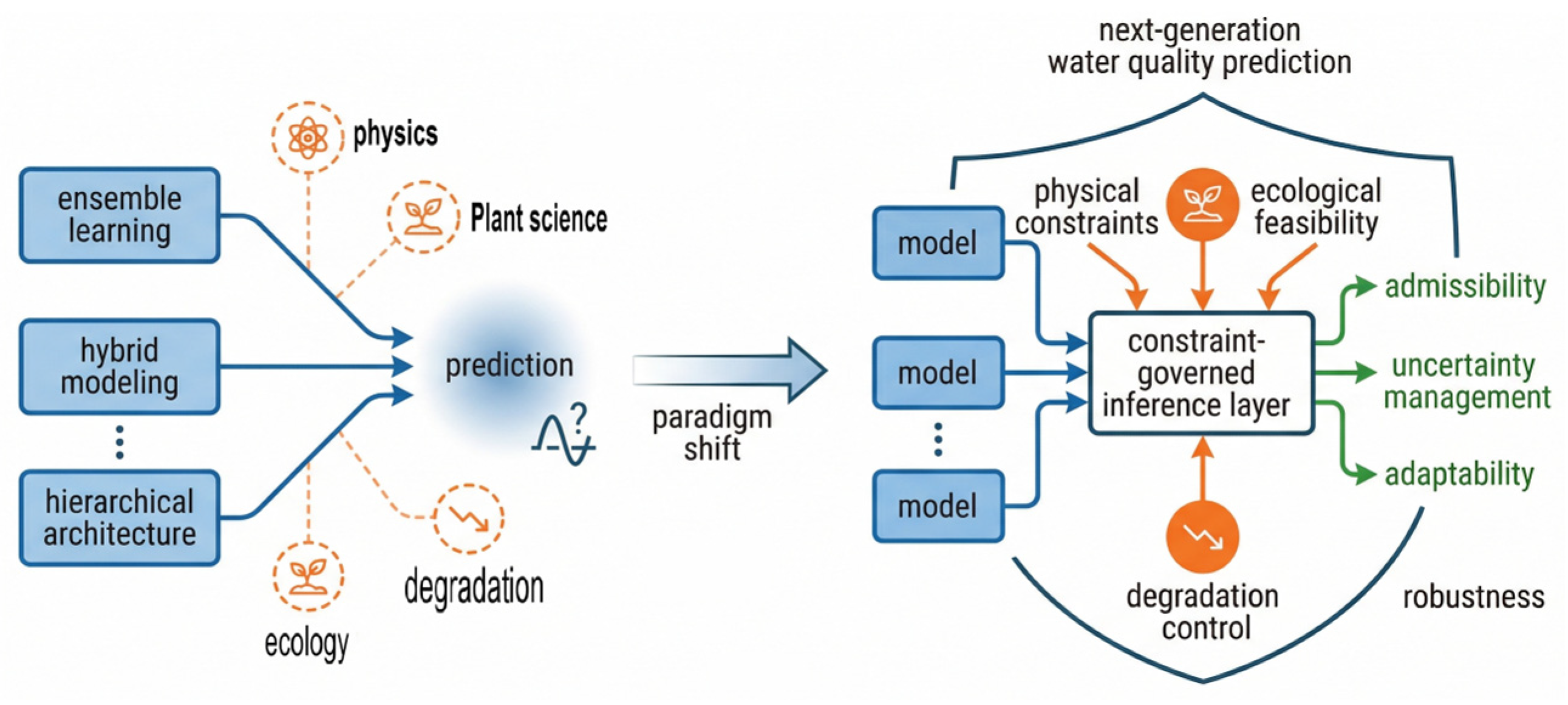 | Transport Constraints | Respects hydrodynamic continuity and dispersion | Advection-dispersion; flow continuity | Stabilizes forecasts during flow disturbances | Ignoring transport leads to spatial inconsistency and timing mismatch | [47] |