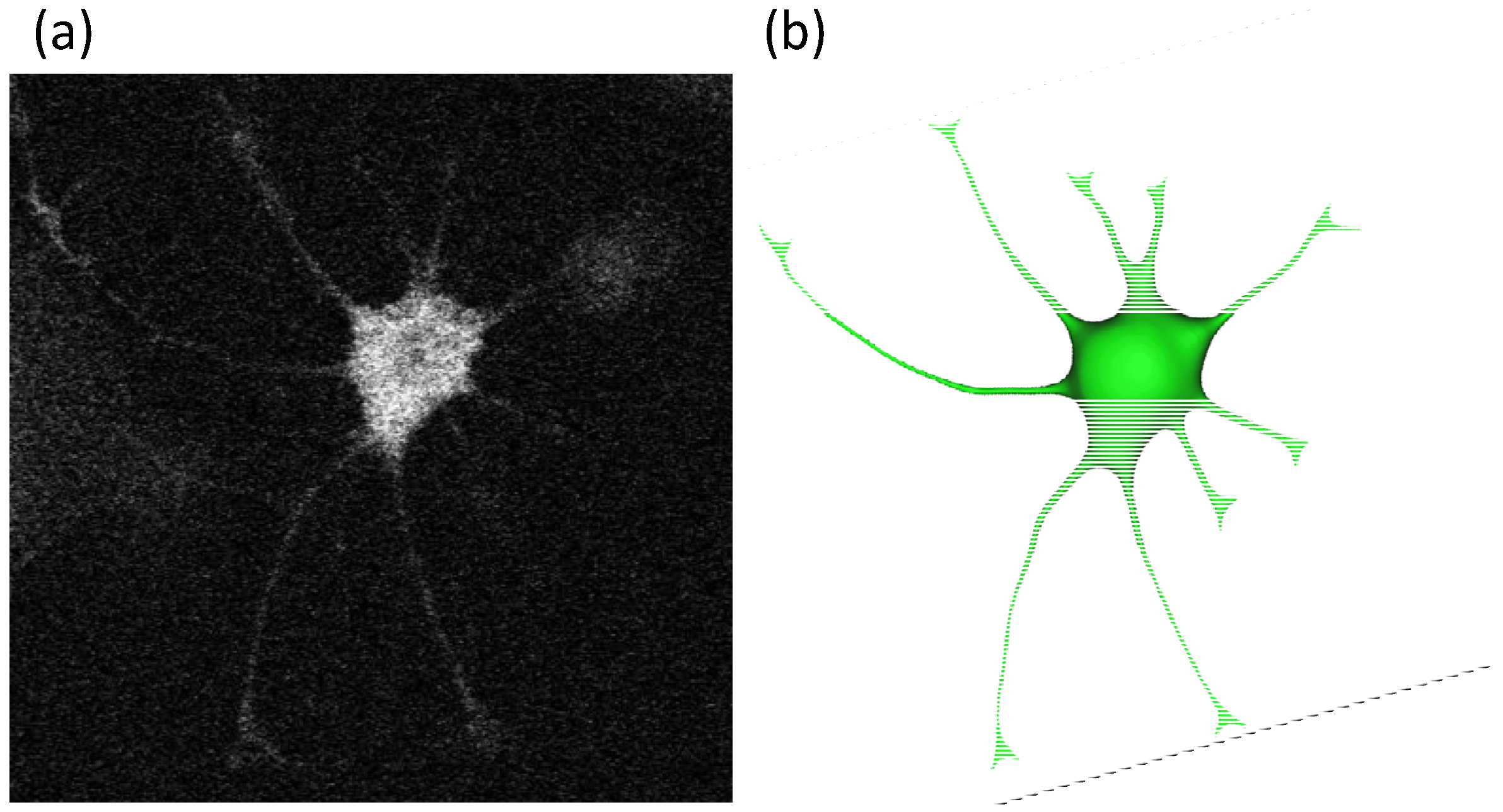 Figure 1. Reconstruction of a single astrocyte cell in 3d. A series of confocal microscopic images (a) were reconstructed to build the 3d model of a single astrocyte (b). The computational mesh of the stellate astrocyte has 11,390 tetrahedron volume elements.