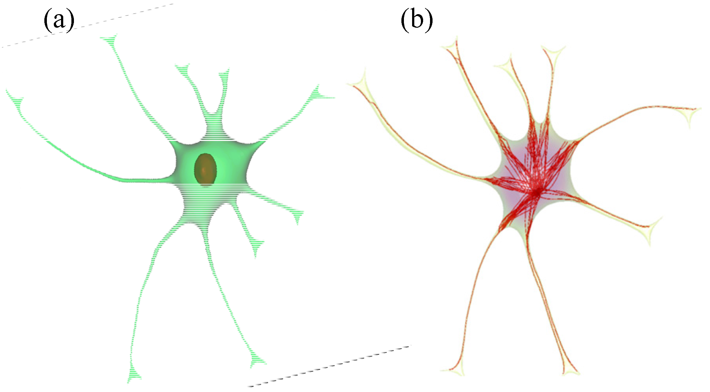 Figure 2. Implementation of nucleus (a) and microtubules (b) into the reconstructed 3d cell model.