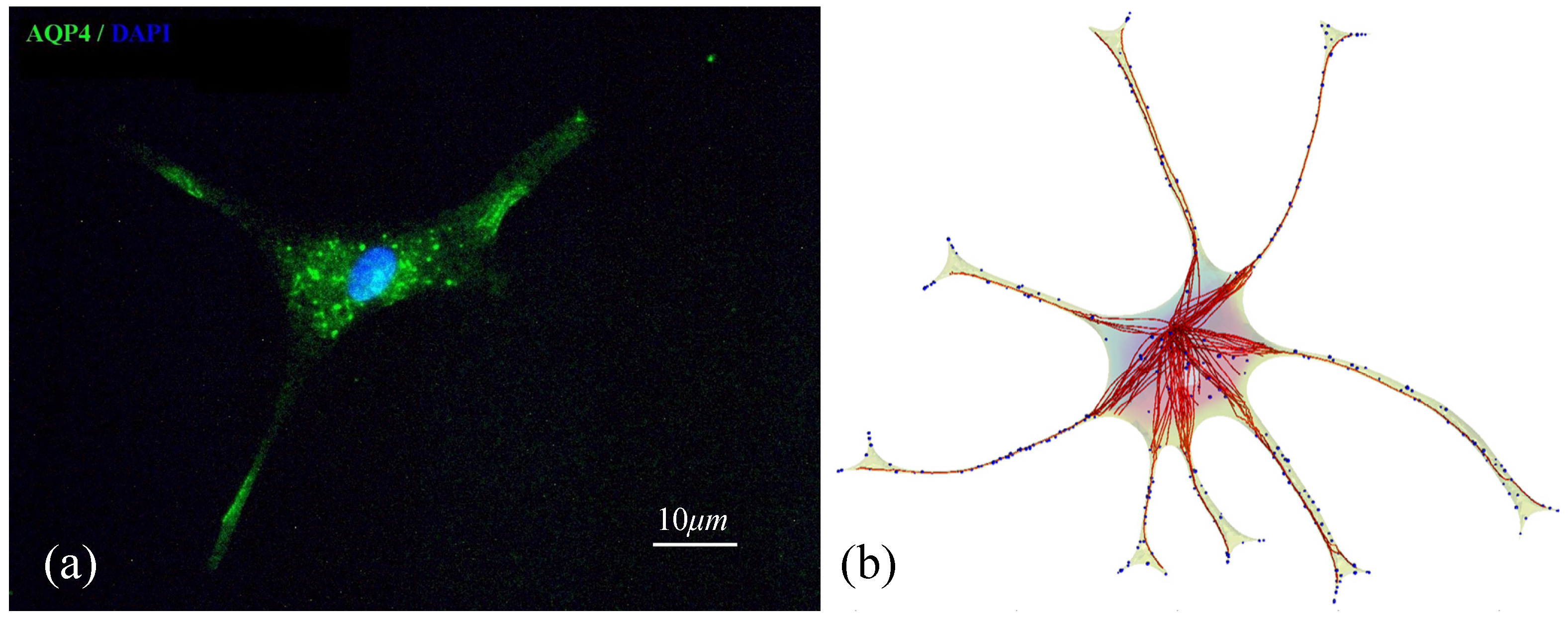 Finally, we demonstrate a qualitative comparison of the spatial AQP4 distribution in a single astrocyte cell with our simulated results as shown in Figure 6. Immunofluorescence image of a single astrocyte stained with anti-AQP4 antibody in Figure 6a shows AQP4-immunopositive vesicles inside the cell body as well as within astrocytic processes. Concentrated AQP4 immunoreactivity is observed in the endfeet processes. The simulated result of spatiotemporal intracellular trafficking of AQP4 in transport vesicles (blue spheres) on the microtubule cytoskeleton (red) of an astrocyte is shown in Figure 6b. In the cell simulator, AQP4 molecules are concentrated at the endfeet of the processes, in agreement with the physiological expression of AQP4. We compared the spatial distribution of AQP4 in our cell simulator with observed patterns of AQP4 expression as shown in Figure 6a.