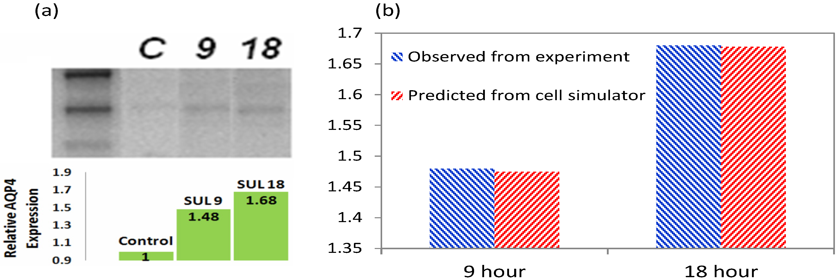 Figure 7. Western blotting shows that SFN induced a 48% upregulation of AQP4 after 9 h of continuous exposure, and 68% upregulation after 18 h compared to control (a); Cell simulator results agree with measured expression levels of AQP4 (b).