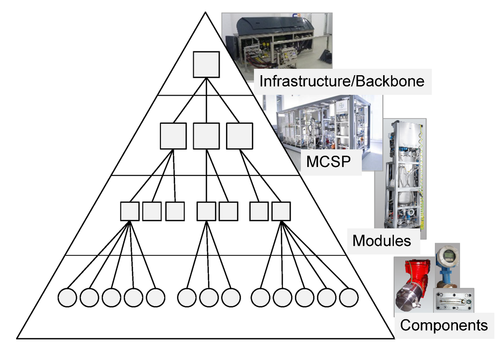 Hierarchical structure of the physical elements within modular and continuously operated small-scale plant (MCSP) planning.