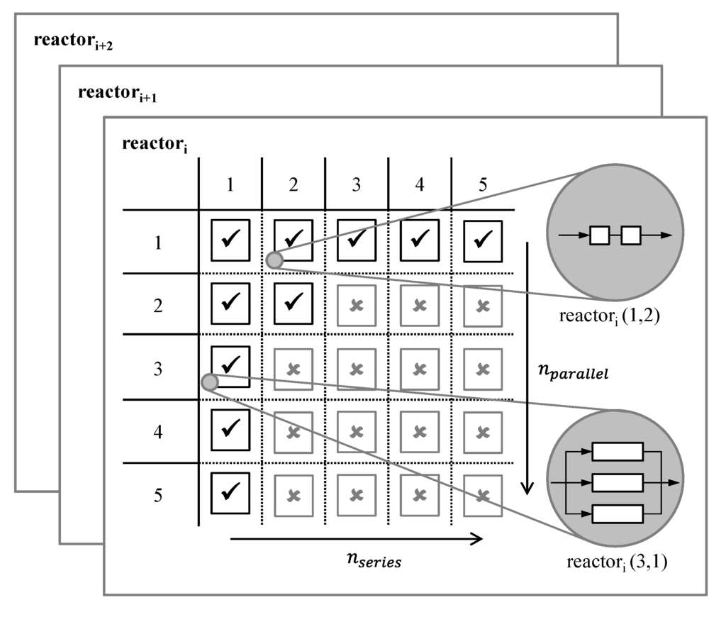 To consider interconnection concepts in the reactor selection methodology presented above, an interconnection matrix is automatically gained for each reactor system in the reactor database (Figure 2). Database information about the available, single reactor elements correspond, e.g., to the number of reactor elements in stock and ready for use, or to the number of reactors fitting into a basic reactor module, due to the outer dimensions of the main apparatus. These database entries can be individually adapted to the particular project. Parallel interconnection can be prohibited from the beginning, e.g., if maldistribution [26] is an issue.