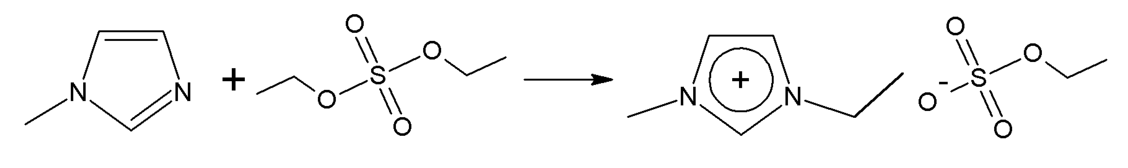 Alkylation of 1-methylimidazol (MIM) with diethyl sulfate (DES) to ethylmethylimidazole ethyl sulfate ([EMIM][EtSO4]) [28].