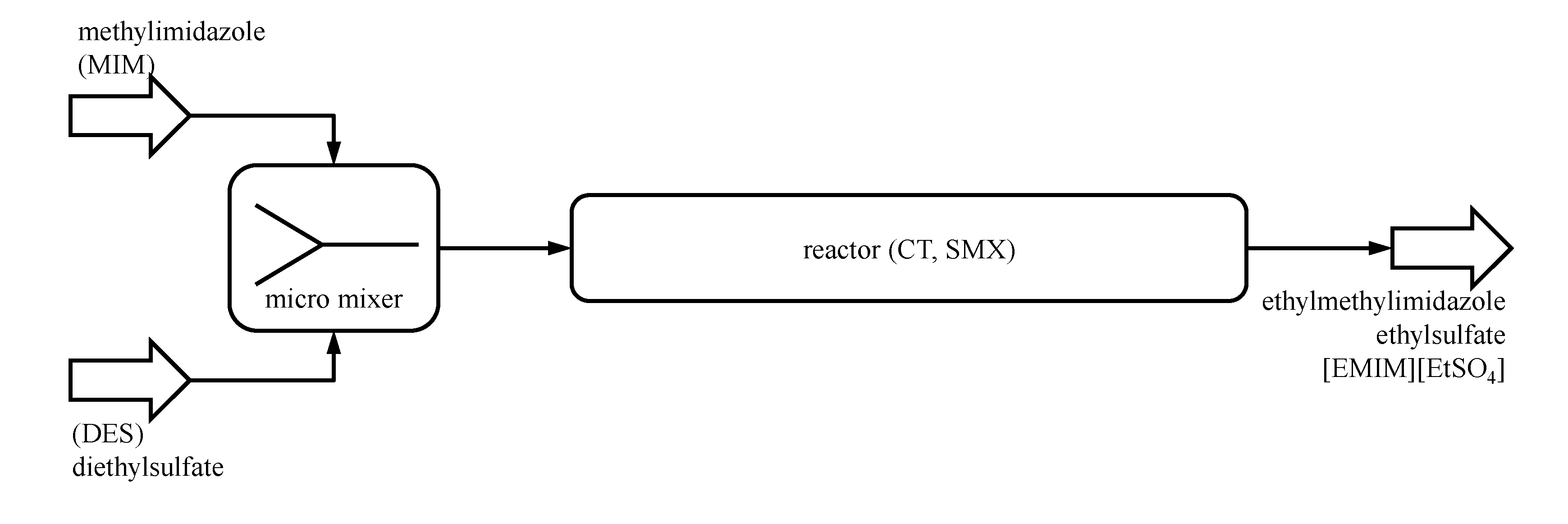 ILs are organic salts with a low melting point and, thus, are often liquid at room temperature. They are known as innovative solvents with beneficial attributes (negligible vapor pressure, designable molecule structure) over conventional solvents and are thus promising for use in chemical processes [31]. For this example, an MCSP process will be assumed, using [EMIM][EtSO4] as a solvent for a reaction step. In continuous operation (24/7), a leaching of the IL takes place, and thus, an amount of 300 g/h of IL has to be provided to restore the losses. A continuous synthesis of the [EMIM][EtSO4] inside the MCSP shall be investigated, designing the reactor with existing, predefined equipment.