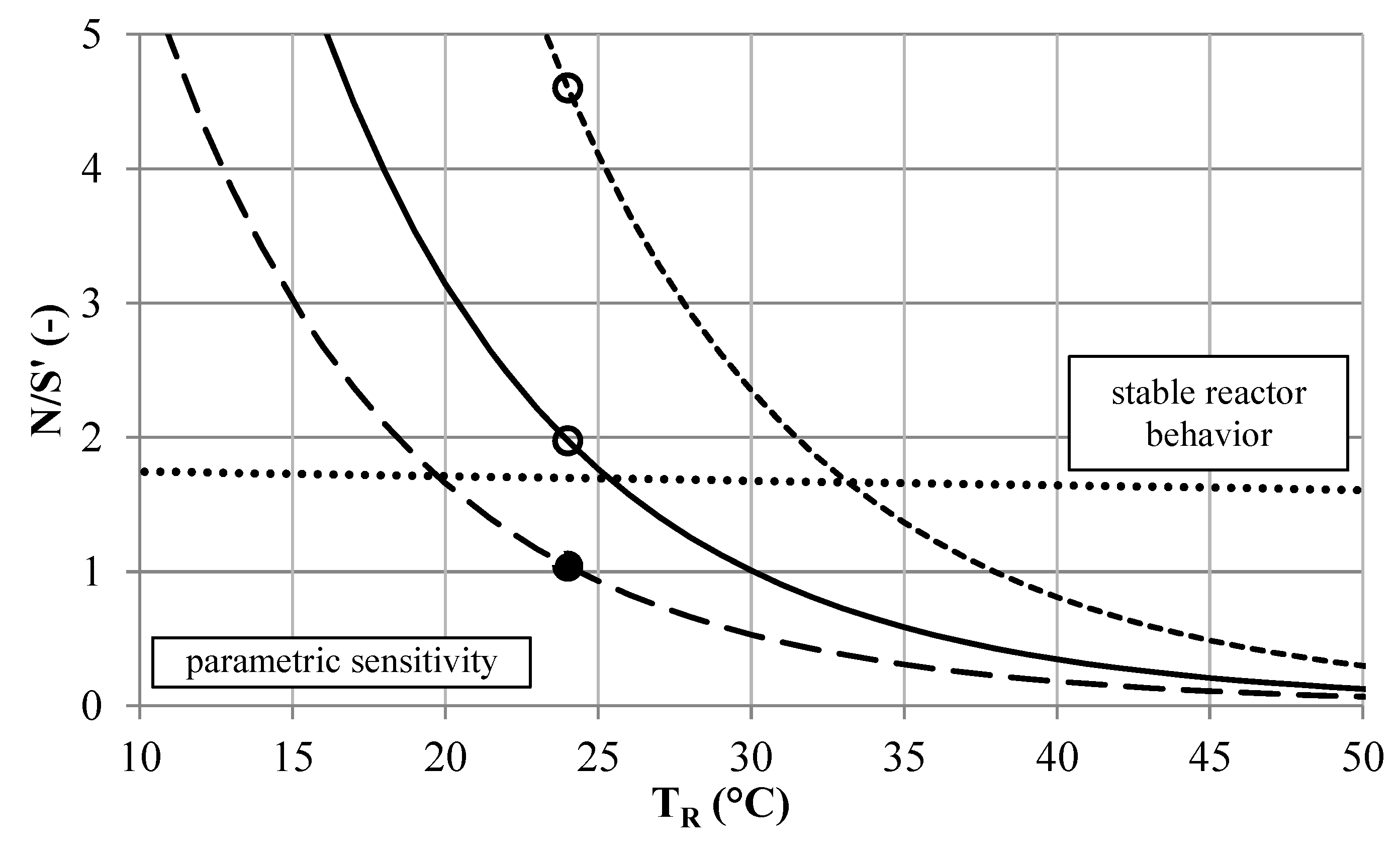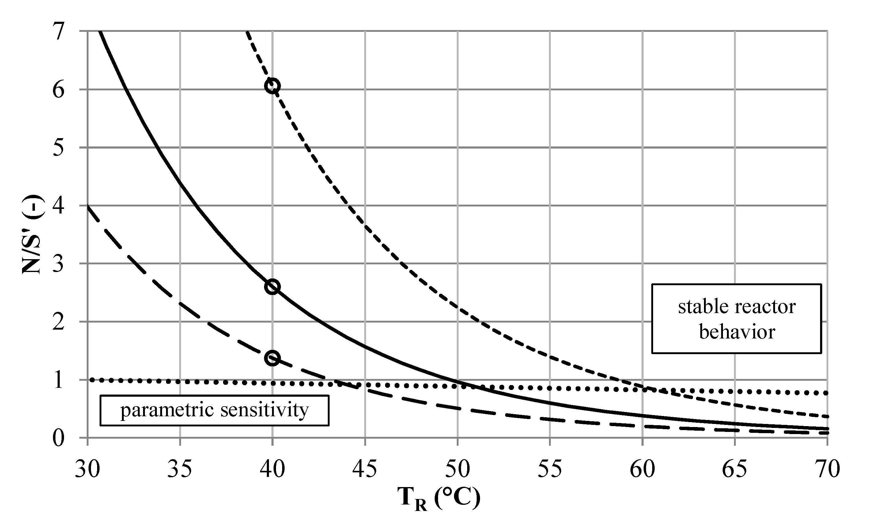 In the case of violating the BR criterion, the reactor operates in a window of parametric sensitivity. Small deviations in reaction temperature lead to a strong increase of the hotspot temperature in the reactor or even to a complete runaway of the reaction. Thus, reactor systems violating the BR criterion will be excluded from the list of technically able reactor systems (technical criterion).