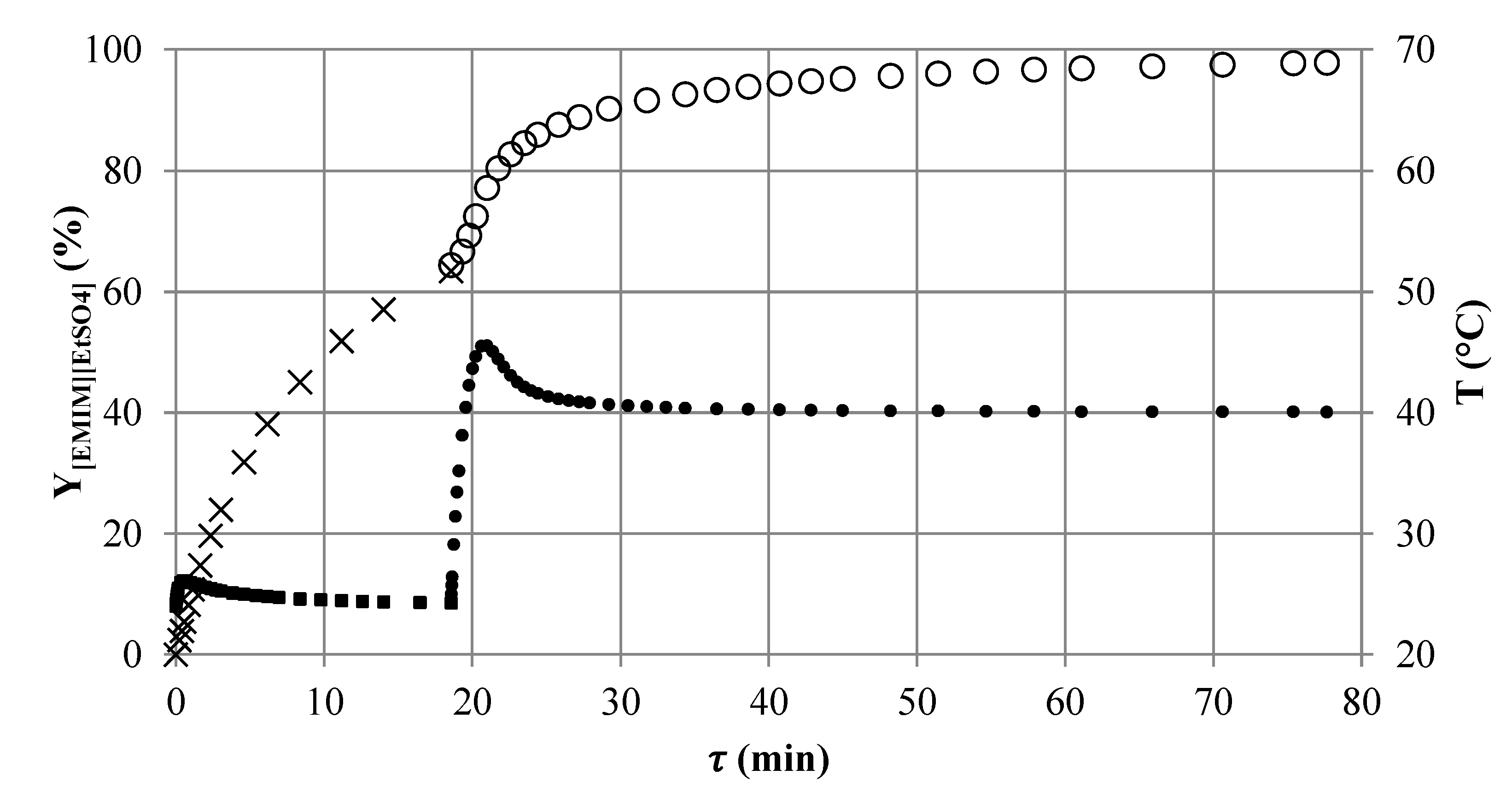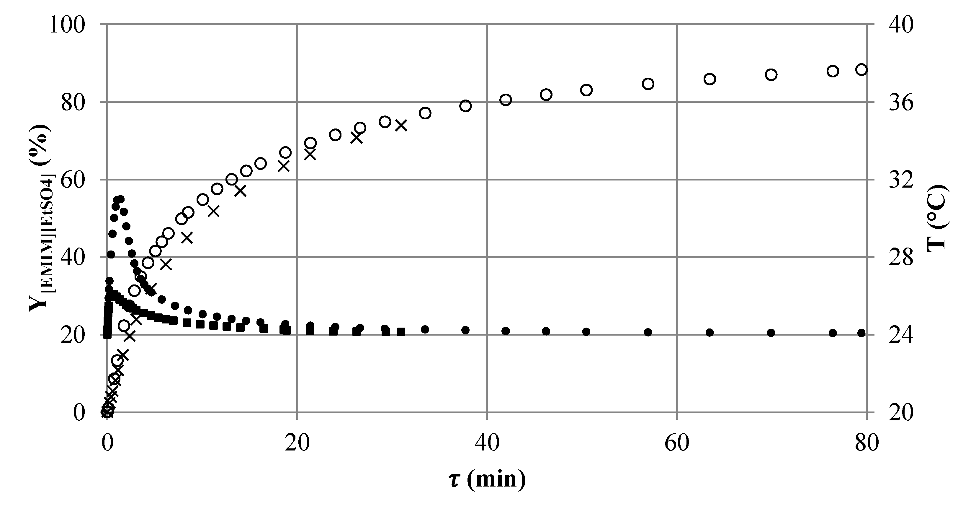 The synthesis reaction of [EMIM][EtSO4] is a highly exothermal (ΔTad ≈ 165.4°C) and fast reaction. The reaction half-life of the pseudo-second order reaction (i.e., first order for both reactants) represents tR = 20 min at a reaction temperature of TR = 20 °C and tR = 3 min at a reaction temperature of TR = 35 °C [28]. Thus, the reaction can be categorized as a Type B/C reaction, according to the nomenclature established by Roberge et al. [20], and thus, the heat of the reaction will be released fast. In order to achieve the desired product quality, the temperature of the reacting fluid has to be kept below 100 °C [28]. The reactants are sensitive to water and cannot be diluted with other solvents, so the reaction is carried out in the bulk phase [32].