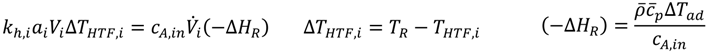 A simplified black-box energy balancing model has been developed in order to compare the heat transfer abilities of different reactors. The flow conditions being defined before and the specific surface area of each reactor are included in the model. The model copes without a mathematical description of the reaction kinetics, but uses information about the heat of the reaction, respectively the adiabatic temperature rise that is accessible by reaction calorimetry. The aim of the black-box model is to calculate a characteristic temperature difference to the HTF at which the total heat of the reaction (complete conversion assumed) can be transferred to the HTF (Equation (7)).