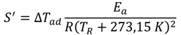 For applying the Barkelew-Renken (BR) criterion (Equation (12)), the energy of activation of the reaction is used to calculate the heat production potential of the reaction (Equation (13)). By the characteristic time constant of the reaction (Equation (9)) and the characteristic time constant of cooling (Equation (14)), the cooling intensity can be defined (Equation (15)). The constant, b, depends to the reaction order and was defined by means of numeric analysis [25].