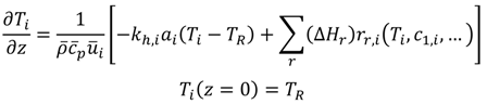 Two methods are implemented in this step of the methodology. Firstly, a safety screening by the use of the short-cut criterion developed by Barkelew for the zeroth-order reaction and extended by Renken for positive order reactions [25]. Thus, unsafe reactor setups can be eliminated before a simulation of the axial concentration and temperature profiles is carried out to calculate the output conversion and the hotspot temperature of the reactor. The inlet temperature and the temperature of the heat transfer medium is set to the value of TR for both calculation steps.