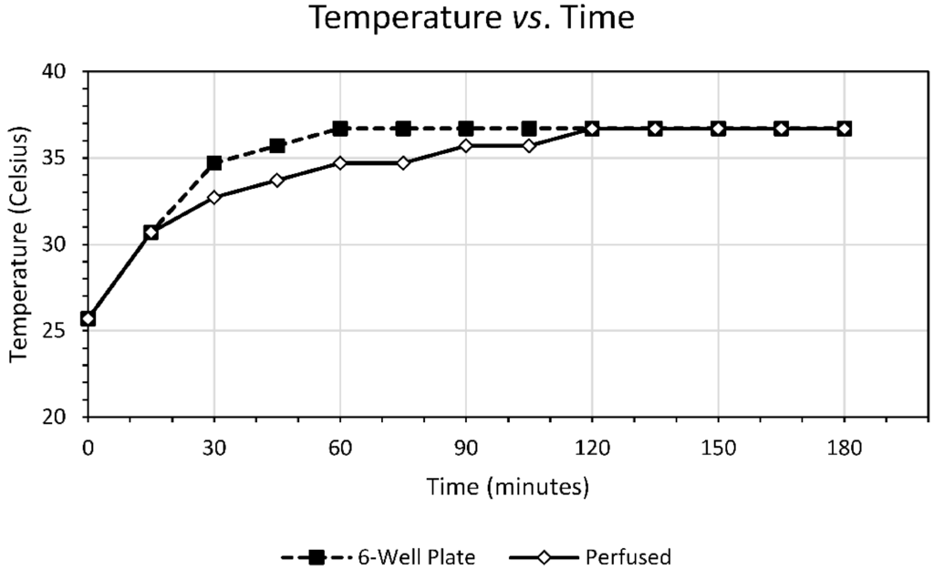 Before introducing cells, the length of time required for the bioreactor’s temperature and pH to equilibrate was measured. This was done to both help further characterize the bioreactor and to ensure that there was no adverse side-effects to there being approx. 8” of tubing carrying media outside the incubator across the external pump from reservoir to bioreactor. The bioreactor chamber and reservoir were filled with 250 mL of Dulbecco Modified Eagle’s Medium (DMEM), and the bioreactor was loaded into the incubator. Media was pumped through the system at 1 mL/min, and the temperature of media in the bioreactor chamber was continuously monitored using a thermocouple probe that fit tightly into the lid port meant for the 0.22 micron membrane filter. If any additional gas exchange was allowed by replacing the membrane filter with the thermocouple, it would not be expected to significantly affect temperature. Temperature readings were also taken from a 6-well plate containing 10 mL of DMEM with the thermocouple probe left in place with the lid removed. The small volume would be expected to equilibrate rapidly and it has a high surface area to volume ratio for gas exchange for temperature and pH comparison against the bioreactor. Temperature readings were taken every 15 min for the first hour and then every 30 min until equilibrium for both experiments. In a separate experiment, both vessels were in the incubator simultaneously using the same media volumes and flow speeds as in the respective temperature experiment for measurement of pH. pH measurements were taken repeatedly on the same volume within each vessel using an Orion 2-Star benchtop pH meter (Thermo Scientific, Waltham, MA, USA) every 15 min for the first hour and then every 30 min until equilibrium.